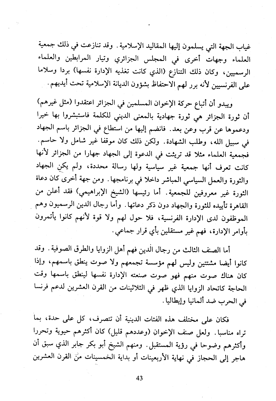 غياب الجهة التي يسلمون إليها المقاليد الإسلامية، وقد تنازعت في ذلك جمعية العلماء وجهات أخرى في المجلس الجزائري وتيار المرابطين والعلماء الرسميين، وكان ذلك التنازع (الذي كانت تغذيه الإدارة نفسها) بردا وسلاما على الفرنسيين لأنه برر لهم الاحتفاظ بشؤون الديانة الإسلامية تحت أيديهم.