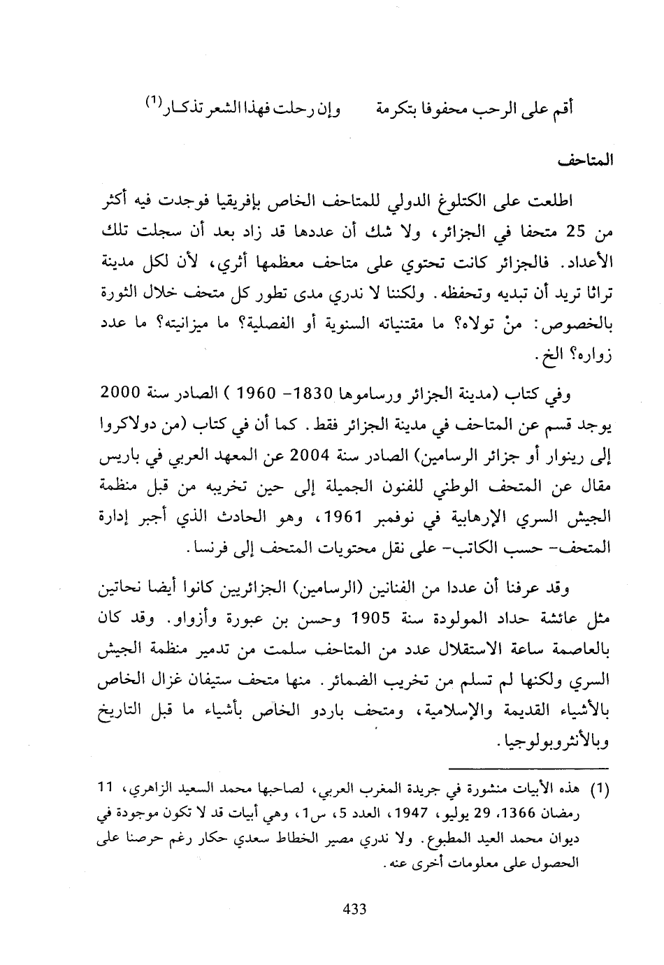 اطلعت على الكتلوغ الدولي للمتاحف الخاص بإفريقيا فوجدت فيه أكثر من 25 متحفا في الجزائر، ولا شك أن عددها قد زاد بعد أن سجلت تلك الأعداد، فالجزائر كانت تحتوي على متاحف معظمها أثري، لأن لكل مدينة تراثا تريد أن تبديه وتحفظه، ولكننا لا ندري مدى تطور كل متحف خلال الثورة بالخصوص: من تولاه؟ ما مقتنياته السنوية أو الفصلية؟ ما ميزانيته؟ ما عدد زواره؟ الخ.