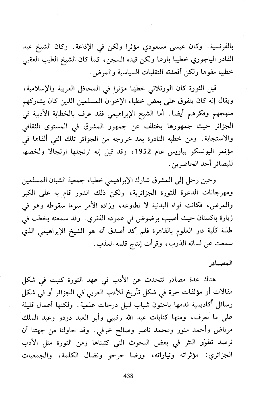بالفرنسية، وكان عيسى مسعودي مؤثرا ولكن في الإذاعة، وكان الشيخ عبد القادر الياجوري خطيبا بارعا ولكن قيده السجن، كما كان الشيخ الطيب العقبي خطيبا مفوها ولكن أقعدته التقلبات السياسية والمرض.