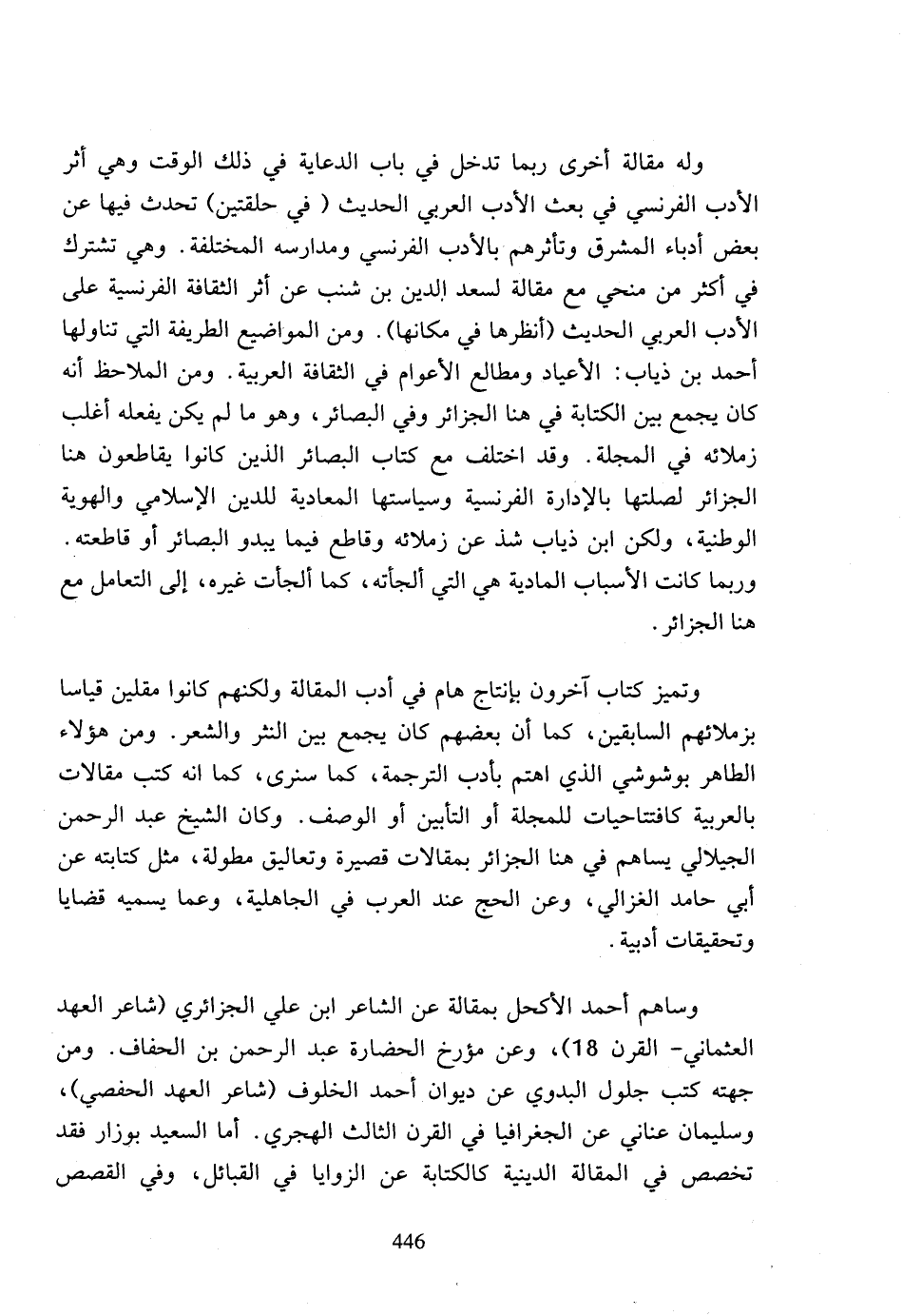 وتميز كتاب آخرون بإنتاج هام في أدب المقالة ولكنهم كانوا مقلين قياسا بزملائهم السابقين، كما أن بعضهم كان يجمع بين النثر والشعر، ومن هؤلاء الطاهر بوشوشي الذي اهتم بأدب الترجمة، كما سنرى، كما أنه كتب مقالات بالعربية كافتتاحيات للمجلة أو التأبين أو الوصف، وكان الشيخ عبد الرحمن الجيلالي يساهم في هنا الجزائر بمقالات قصيرة وتعاليق مطولة، مثل كتابته عن أبي حامد الغزالي، وعن الحج عند العرب في الجاهلية، وعما يسميه قضايا وتحقيقات أدبية.