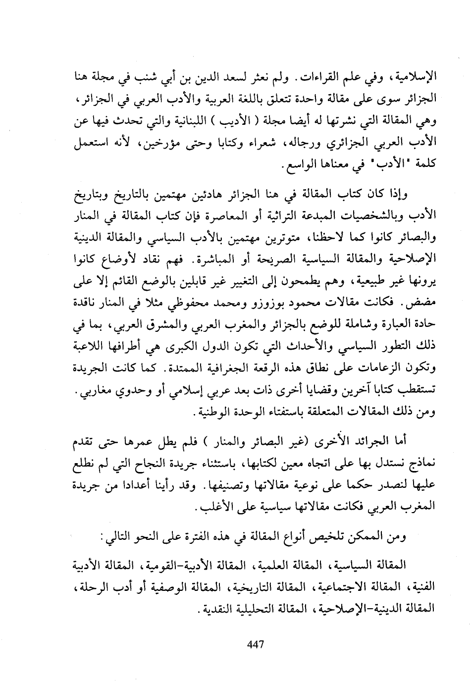 أما الجرائد الأخرى (غير البصائر والمنار) فلم يطل عمرها حتى تقدم نماذج نستدل بها على اتجاه معين لكتابها، باستثناء جريدة النجاح التي لم نطلع عليها لنصدر حكما على نوعية مقالاتها وتصنيفها، وقد رأينا أعدادا من جريدة المغرب العربي فكانت مقالاتها سياسية على الأغلب.