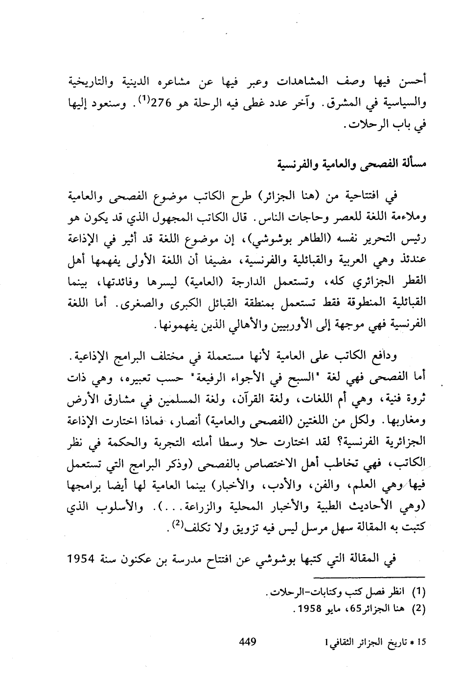 ودافع الكاتب على العامية لأنها مستعملة في مختلف البرامج الإذاعية. أما الفصحى فهي لغة (السبح في الأجواء الرفيعة) حب تعبيره، وهي ذات ثروة فنية، وهي أم اللغات، ولغة القرآن، ولغة المسلمين في مشارق الأرض ومغاربها، ولكل من اللغتين (الفصحى والعامية) أنصار، فماذا اختارت الإذاعة الجزائرية الفرنسية؟ لقد اختارت حلا وسطا أملته التجربة والحكمة في نظر الكاتب، فهي تخاطب أهل الاختصاص بالفصحى (وذكر البرامج التي تستعمل فيها وهي العلم، والفن، والأدب، والأخبار) بينما العامية لها أيضا برامجها (وهي الأحاديث الطبية والأخبار المحلية والزراعة ...)، والأسلوب الذي كتبت به المقالة سهل مرسل ليس فيه تزويق ولا تكلف (2).