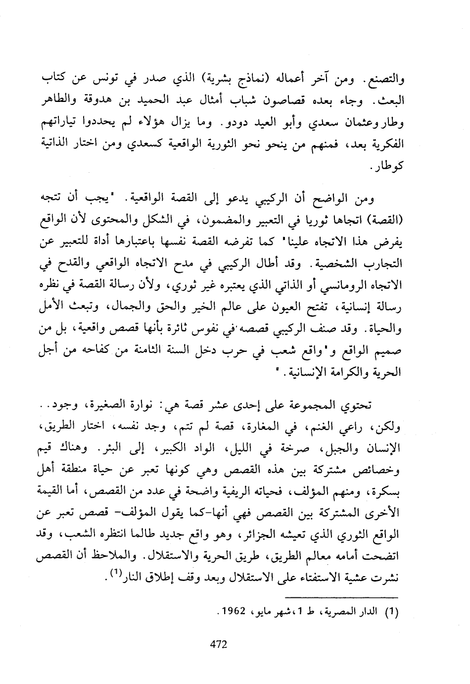 والتصنع، ومن آخر أعماله (نماذج بشرية) الذي صدر في تونس عن كتاب البعث، وجاء بعده قصاصون شباب أمثال عبد الحميد بن هدوقة والطاهر وطار وعثمان سعدي وأبو العيد دودو، وما يزال هؤلاء لم يحددوا تياراتهم الفكرية بعد، فمنهم من ينحو نحو الثورية الواقعية كسعدي ومن اختار الذاتية كوطار.