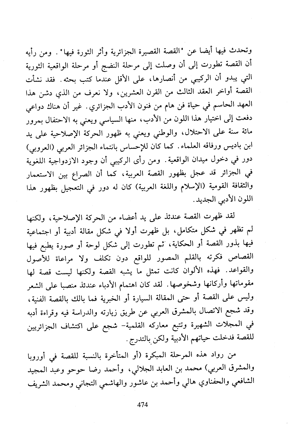 وتحدث فيها أيضا عن (القصة القعيرة الجزائرية وأثر الثورة فيها)، ومن رأيه أن القصة تطورت إلى أن وصلت إلى مرحلة النضج أو مرحلة الواقعية الثورية التي يبدو أن الركيبي من أنصارها، على الأقل عندما كتب بحثه، فقد نشأت القصة أواخر العقد الثالث من القرن العشرين، ولا نعرف من الذي دشن هذا العهد الحاسم في حياة فن هام من فنون الأدب الجزائري، غير أن هناك دواعي دفعت إلى اختيار هذا اللون من الأدب، منها السياسي ويعني به الاحتفال بمرور مائة سنة على الاحتلال، والوطني ويعني به ظهور الحركة الإصلاحية على يد ابن باديس ورفاقه العلماء، كما كان للإحساس بانتماء الجزائر العربي (العروبي) دور في دخول ميدان الواقعية، ومن رأى الركيبي أن وجود الازدواجية اللغوية