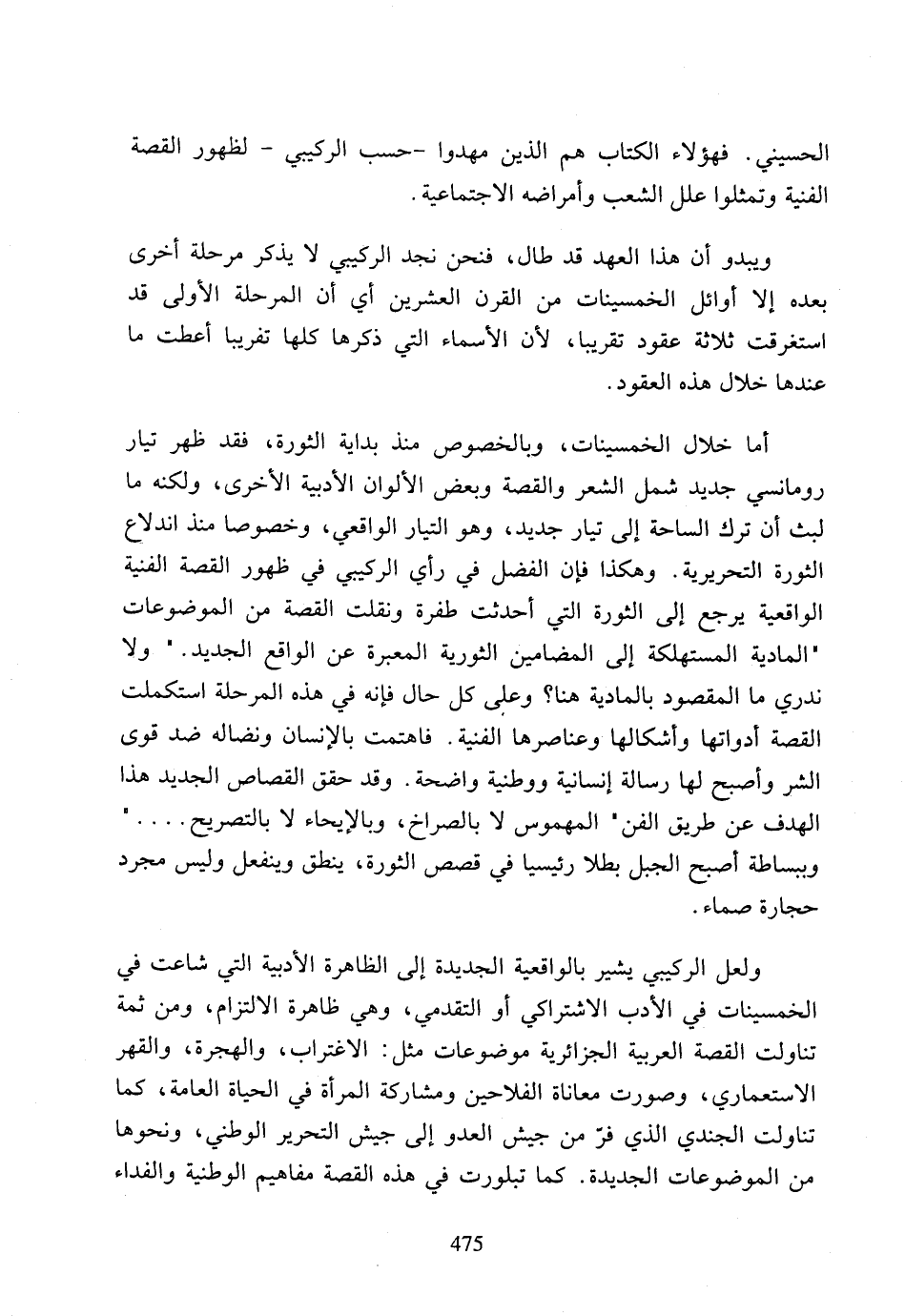 ولعل الركيبي يشير بالواقعية الجديدة إلى الظاهرة الأدبية التي شاعت في الخمسينات في الأدب الاشتراكي أو التقدمي، وهي ظاهرة الالتزام، ومن ثمة تناولت القصة العربية الجزائرية موضوعات مثل: الاغتراب، والهجرة، والقهر الاستعماري، وصورت معاناة الفلاحين ومشاركة المرأة في الحياة العامة، كما تناولت الجندي الذي فر من جيش العدو إلى جيش التحرير الوطني، ونحوها من الموضوعات الجديدة، كما تبلورت في هذه القصة مفاهيم الوطنية والفداء