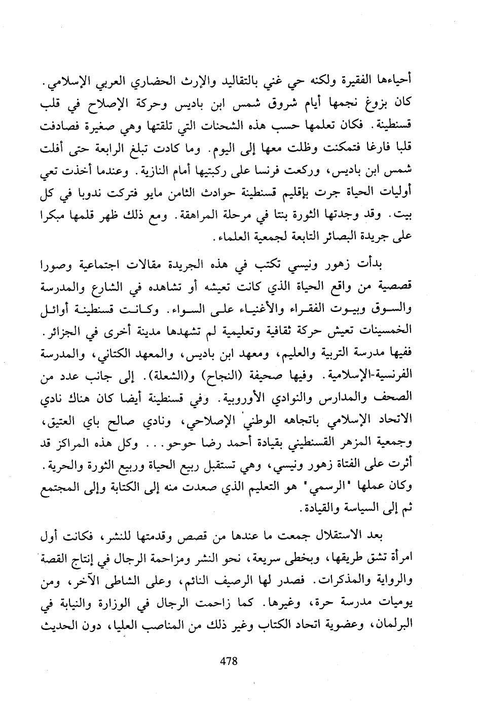 أحياءها الفقيرة ولكنه حي غني بالتقاليد والإرث الحضاري العربي الإسلامي. كان بزوغ نجمها أيام شروق شمس ابن باديس وحركة الإصلاح في قلب قسنطينة، فكان تعلمها حسب هذه الشحنات التي تلقتها وهي صغيرة فصادفت قلبا فارغا فتمكنت وظلت معها إلى اليوم، وما كادت تبلغ الرابعة حتى أفلت شمس ابن باديس، وركعت فرنسا على ركبتيها أمام النازية، وعندما أخذت تعي أوليات الحياة جرت بإقليم قسنطينة حوادث الثامن مايو فتركت ندوبا في كل بيت، وقد وجدتها الثورة بنتا في مرحلة المراهقة، ومع ذلك ظهر قلمها مبكرا على جريدة البصائر التابعة لجمعية العلماء.