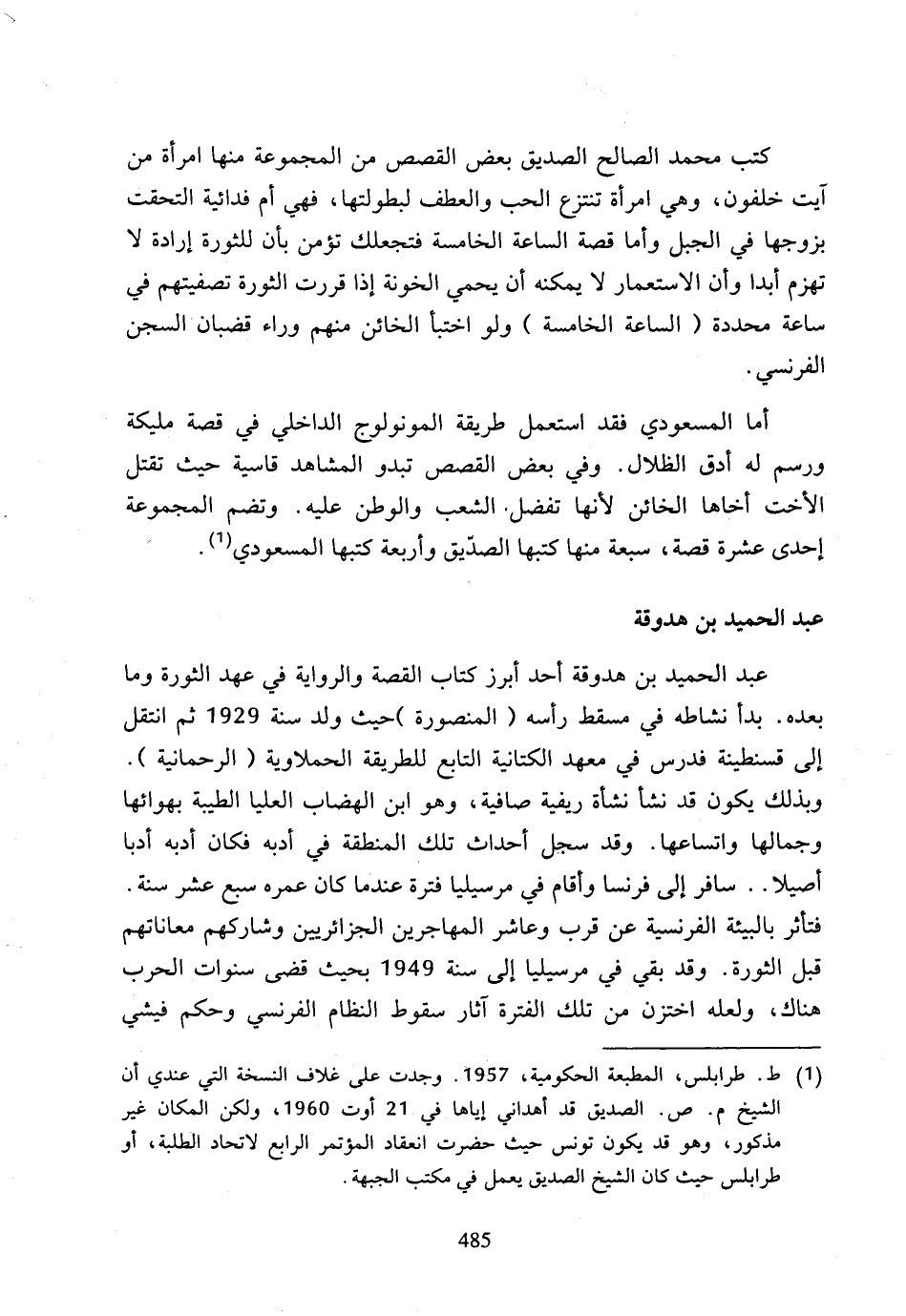 (1) ط، طرابلس، المطبعة الحكومية، 1957، وجدت على غلاف النسخة التي عندي أن الشيخ م، ص، الصديق قد أهداني إياها في 21 أوت 1960، ولكن المكان غير مذكور، وهو قد يكون تونس حيث حضرت انعقاد المؤتمر الرابع لاتحاد الطلبة، أو طرابلس حيث كان الشيخ الصديق يعمل في مكتب الجبهة.