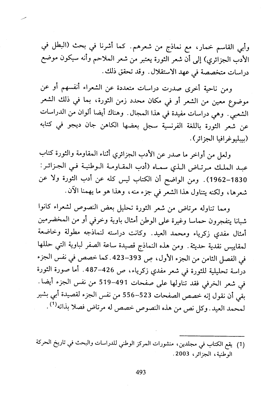وأبي القاسم خمار، مع نماذج من شعرهم، كما أشرنا في بحث (البطل في الأدب الجزائري) إلى أن شعر الثورة يعتبر من شعر الملاحم وأنه سيكون موضع دراسات متخصصة في عهد الاستقلال، وقد تحقق ذلك.