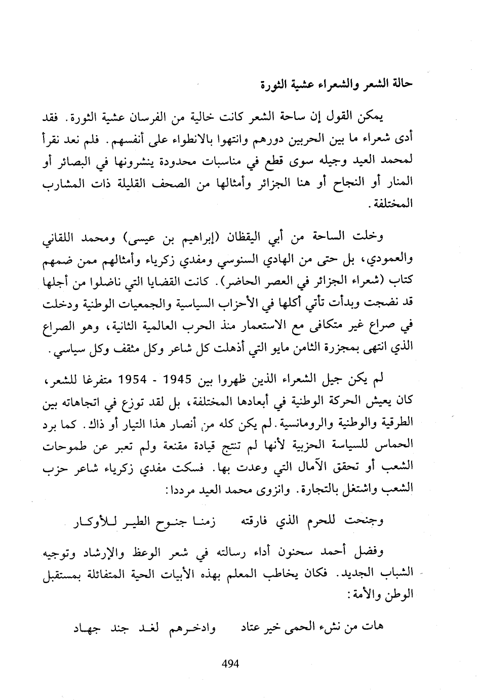 وخلت الساحة من أبي اليقظان (إبراهيم بن عيسى) ومحمد اللقاني والعمودي، بل حتى من الهادي السنوسي ومفدي زكرياء وأمثالهم ممن ضمهم كتاب (شعراء الجزائر في العصر الحاضر)، كانت القضايا التي ناضلوا من أجلها قد نضجت وبدأت تأتي أكلها في الأحزاب السياسية والجمعيات الوطنية ودخلت في صراع غير متكافى مع الاستعمار منذ الحرب العالمية الثانية، وهو الصراع الذي انتهى بمجزرة الثامن مايو التي أذهلت كل شاعر وكل مثقف وكل سياسي.