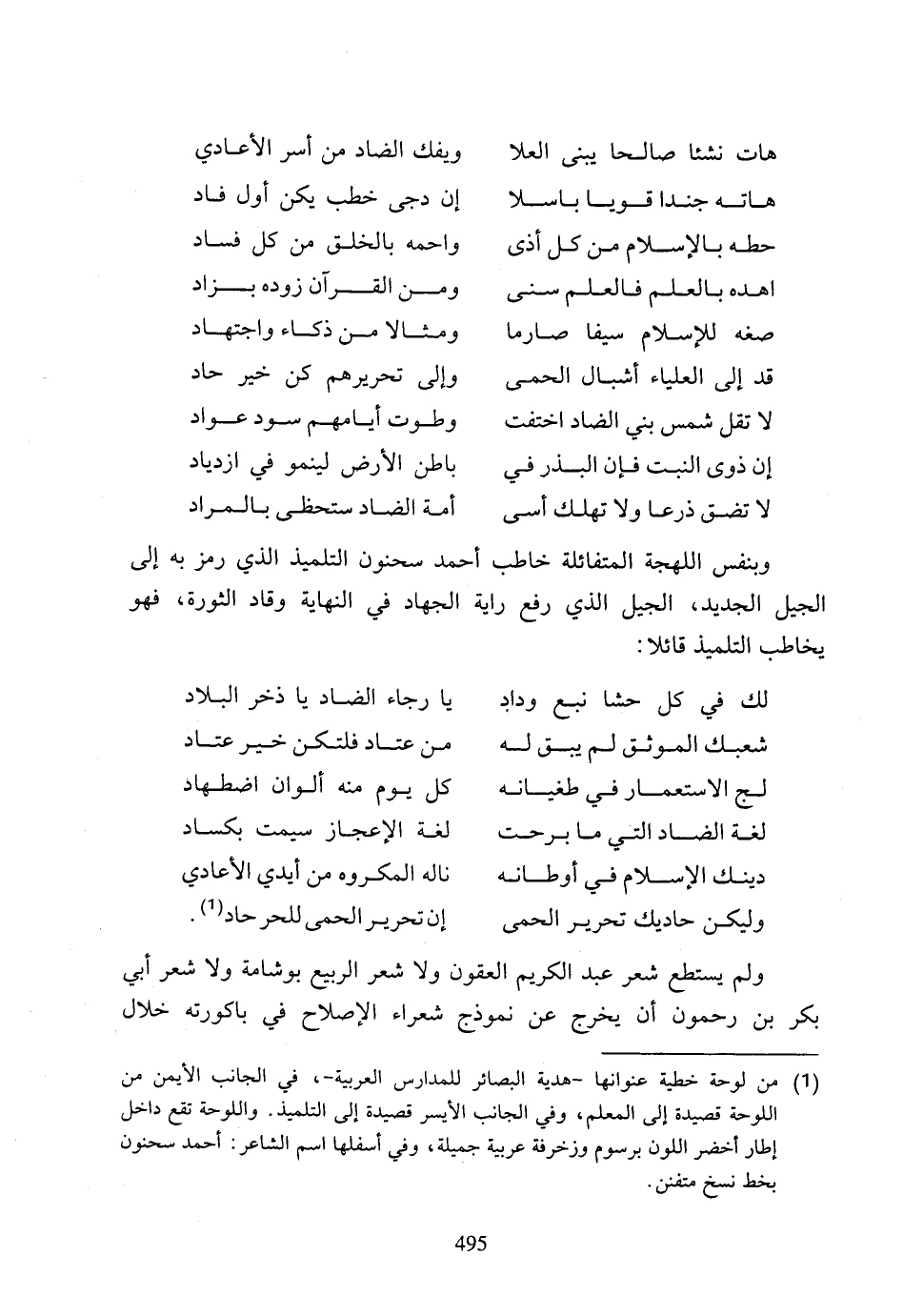 (1) من لوحة خطية عنوانها - هدية البصائر للمدارس العربية -، في الجانب الأيمن من اللوحة قصيدة إلى المعلم، وفي الجانب الأيسر قصيدة إلى التلميذ، واللوحة تقع داخل إطار أخضر اللون برسوم وزخرفة عرية جميلة، وفي أسفلها اسم الشاعر: أحمد سحنون بخط نسخ متفنن.