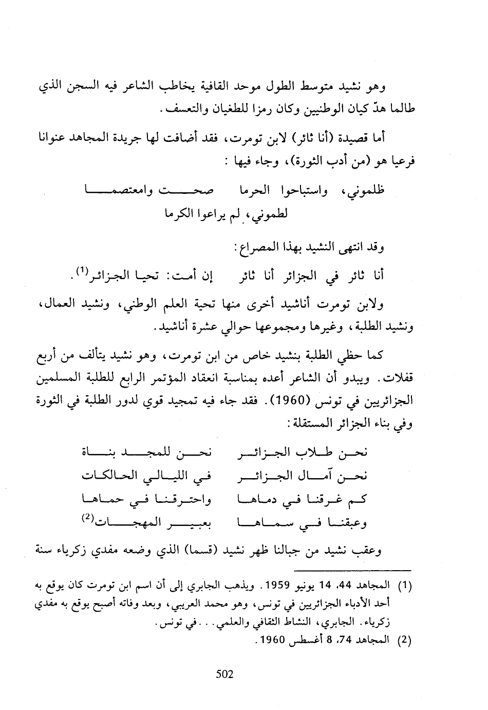 (1) المجاهد 44، 14 يونيو 1959، ويذهب الجابري إلى أن اسم ابن تومرت كان يوقع به أحد الأدباء الجزائريين في تونس، وهو محمد العريبي، وبعد وفاته أصبح يوقع به مفدي زكرياء، الجابري، النشاط الثقافي والعلمي ... في تونس.
