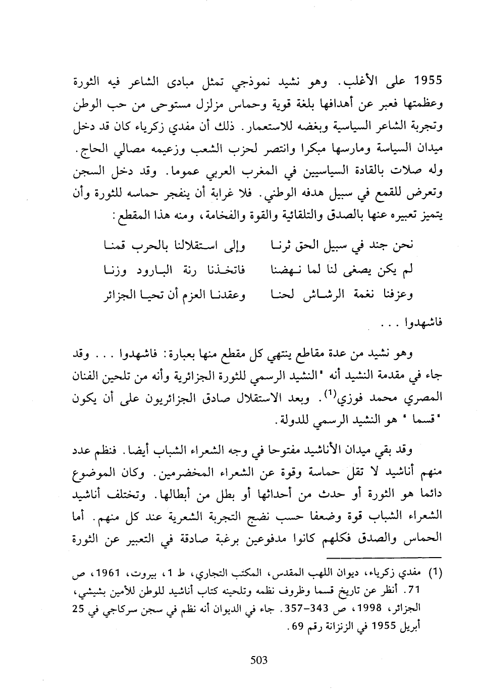 1955 على الأغلب، وهو نشيد نموذجي تمثل مبادى الشاعر فيه الثورة وعظمتها فعبر عن أهدافها بلغة قوية وحماس مزلزل مستوحى من حب الوطن وتجربة الشاعر السياسية وبغضه للاستعمار. ذلك أن مفدي زكرياء كان قد دخل ميدان السياسة ومارسها مبكرا وانتصر لحزب الشعب وزعيمه مصالي الحاج، وله صلات بالقادة السياسيين في المغرب العربي عموما، وقد دخل السجن وتعرض للقمع في سبيل هدفه الوطني، فلا غرابة أن ينفجر حماسه للثورة وأن يتميز تعبيره عنها بالصدق والتلقائية والقوة والفخامة، ومنه هذا المقطع: