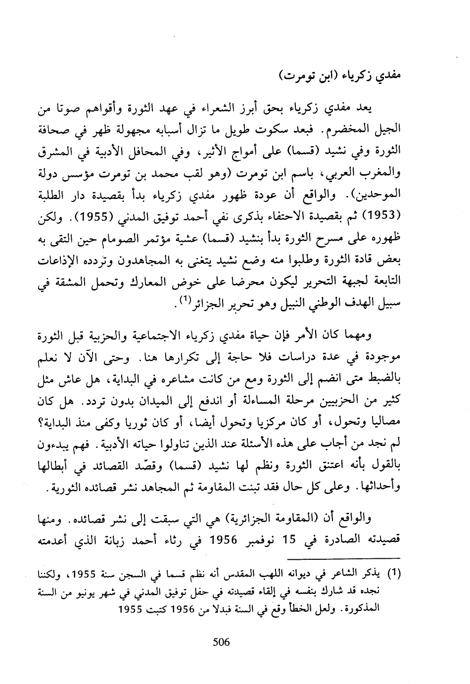 (1) يذكر الشاعر في ديوانه اللهب المقدس أنه نظم قسما في السجن سنة 1955، ولكننا نجده قد شارك بنفسه في إلقاء قصيدته في حفل توفيق المدني في شهر يونيو من السنة المذكورة، ولعل الخطأ وقع في السنة فبدلا من 1956 كتبت 1955.