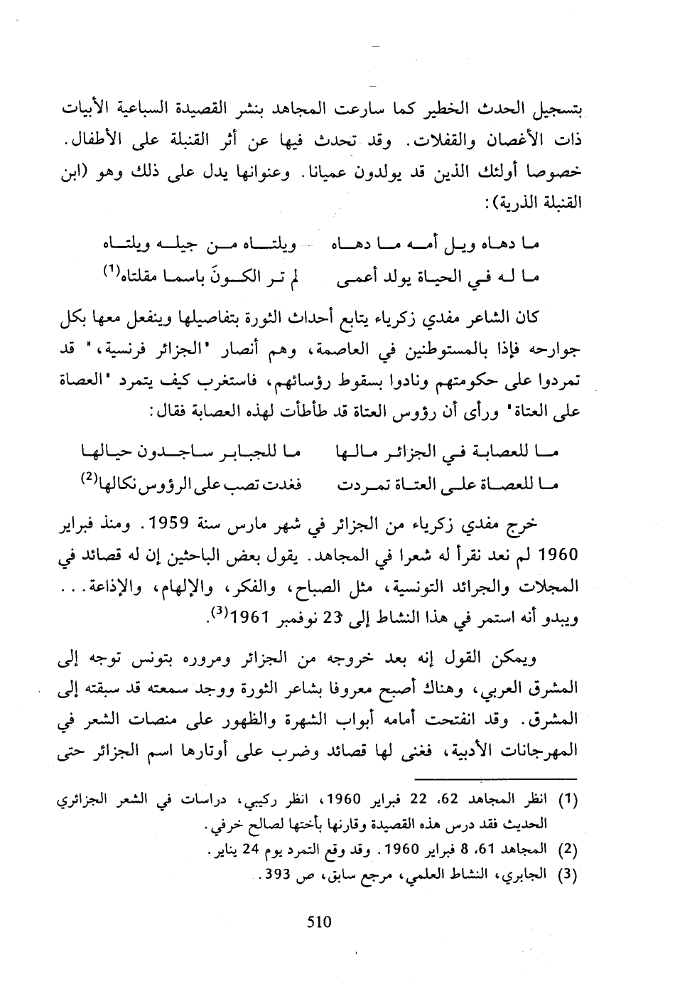 (1) انظر المجاهد 62، 22 فبراير 1960، انظر ركيبي، دراسات في الشعر الجزائري الحديث فقد درس هذه القصيدة وقارنها بأختها لصالح خرفي.