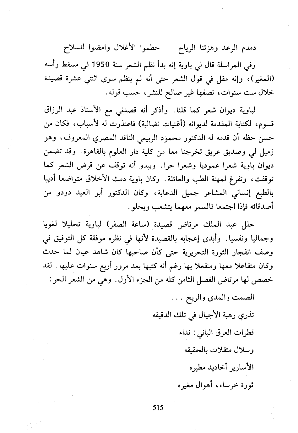 لباوية ديوان شعر كما قلنا، وأذكر أنه قصدني مع الأستاذ عبد الرزاق قسوم، لكتابة المقدمة لديوانه (أغنيات نضالية) فاعتذرت له لأسباب، فكان من حسن حظه أن قدمه له الدكتور محمود الربيعي الناقد المصري المعروف، وهو زميل لي وصديق عريق تخرجنا معا من كلية دار العلوم بالقاهرة، وقد تضمن ديوان باوية شعرا عموديا وشعرا حرا، ويبدو أنه توقف عن قرض الشعر كما توقفت، وتفرغ لمهنة الطب والعائلة، وكان باوية دمث الأخلاق متواضعا أديبا بالطبع إنساني المشاعر جميل الدعابة، وكان الدكتور أبو العيد دودو من أصدقائه فإذا اجتمعا فالسمر معهما يتشعب ويحلو.