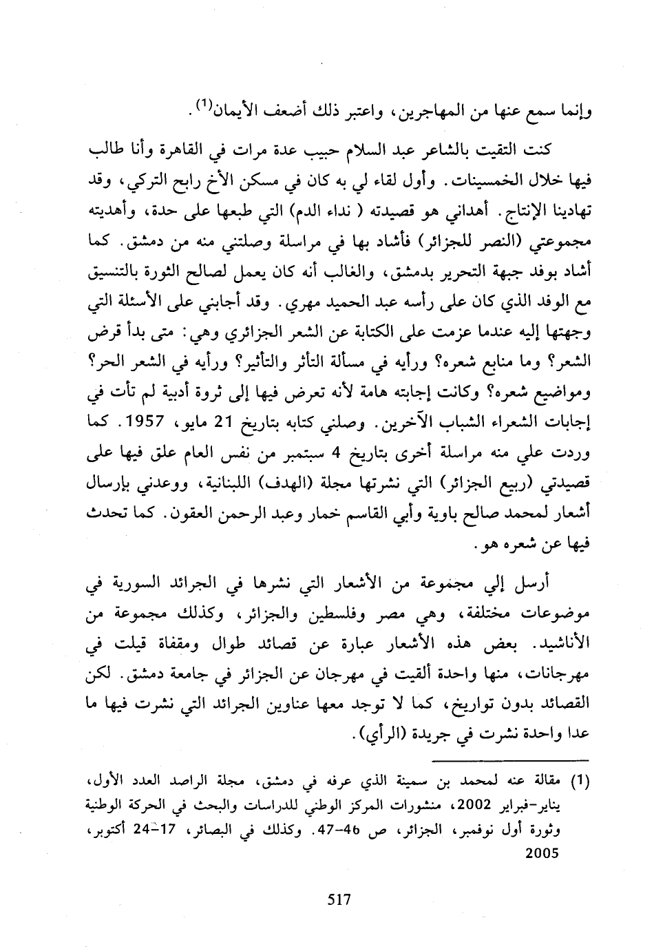 كنت التقيت بالشاعر عبد السلام حبيب عدة مرات في القاهرة وأنا طالب فيها خلال الخمسينات، وأول لقاء لي به كان في مسكن الأخ رابح التركي، وقد تهادينا الإنتاج، أهداني هو قصيدته (نداء الدم) التي طبعها على حدة، وأهديته مجموعتي (النصر للجزائر) فأشاد بها في مراسلة وصلتني منه من دمشق، كما أشاد بوفد جبهة التحرير بدمشق، والغالب أنه كان يعمل لصالح الثورة بالتنسيق مع الوفد الذي كان على رأسه عبد الحميد مهري، وقد أجابني على الأسئلة التي وجهتها إليه عندما عزمت على الكتابة عن الشعر الجزائري وهي: متى بدأ قرض الشعر؟ وما منابع شعره؟ ورأيه في مسألة التأثر والتأثير؟ ورأيه في الشعر الحر؟ ومواضيع شعره؟ وكانت إجابته هامة لأنه تعرض فيها إلى ثروة أدبية لم تأت في إجابات الشعراء الشباب الآخرين، وصلني كتابه بتاريخ 21 مايو، 1957، كما وردت علي منه مراسلة أخرى بتاريخ 4 سبتمبر من نفس العام علق فيها على قصيدتي (ربيع الجزائر) التي نشرتها مجلة (الهدف) اللبنانية، ووعدني بإرسال أشعار لمحمد صالح باوية وأبي القاسم خمار وعبد الرحمن العقون، كما تحدث فيها عن شعره هو.