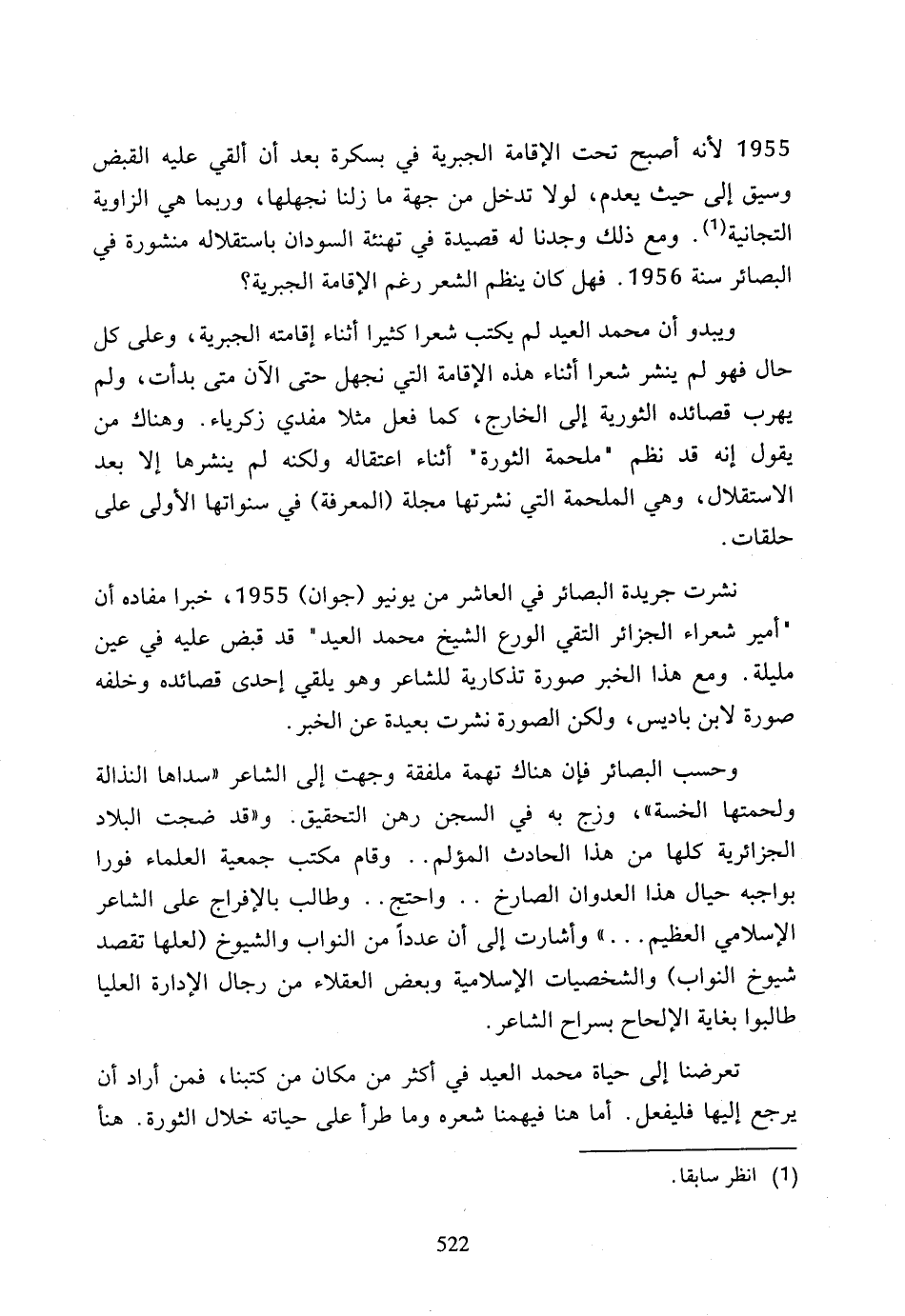 1955 لأنه أصبح تحت الإقامة الجبرية في بسكرة بعد أن ألقي عليه القبض وسيق إلى حيث يعدم، لولا تدخل من جهة ما زلنا نجهلها، وربما هي الزاوية التجانية (1)، ومع ذلك وجدنا له قصيدة في تهنئة السودان باستقلاله منشورة في البصائر سنة 1956، فهل كان ينظم الشعر رغم الإقامة الجبرية؟