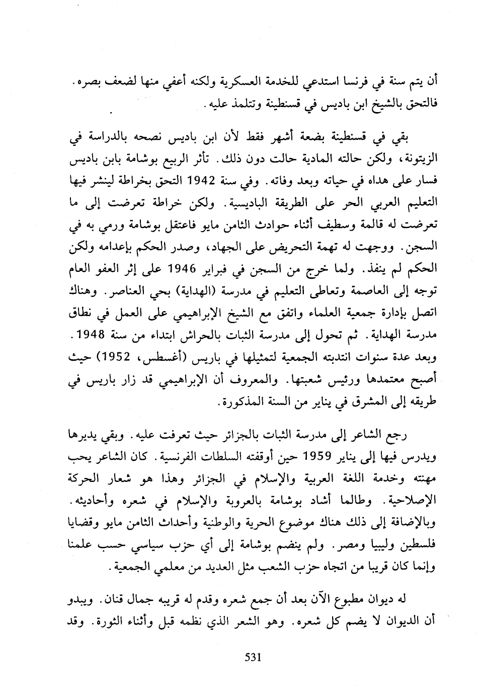 رجع الشاعر إلى مدرسة الثبات بالجزائر حيث تعرفت عليه، وبقي يديرها ويدرس فيها إلى يناير 1959 حين أوقفته السلطات الفرنسية، كان الشاعر يحب مهنته وخدمة اللغة العربية والإسلام في الجزائر وهذا هو شعار الحركة الإصلاحية، وطالما أشاد بوشامة بالعروبة والإسلام في شعره وأحاديثه، وبالإضافة إلى ذلك هناك موضوع الحرية والوطنية وأحداث الثامن مايو وقضايا فلسطين وليبيا ومصر، ولم ينضم بوشامة إلى أي حزب سياسي حسب علمنا وإنما كان قريبا من اتجاه حزب الشعب مثل العديد من معلمي الجمعية.
