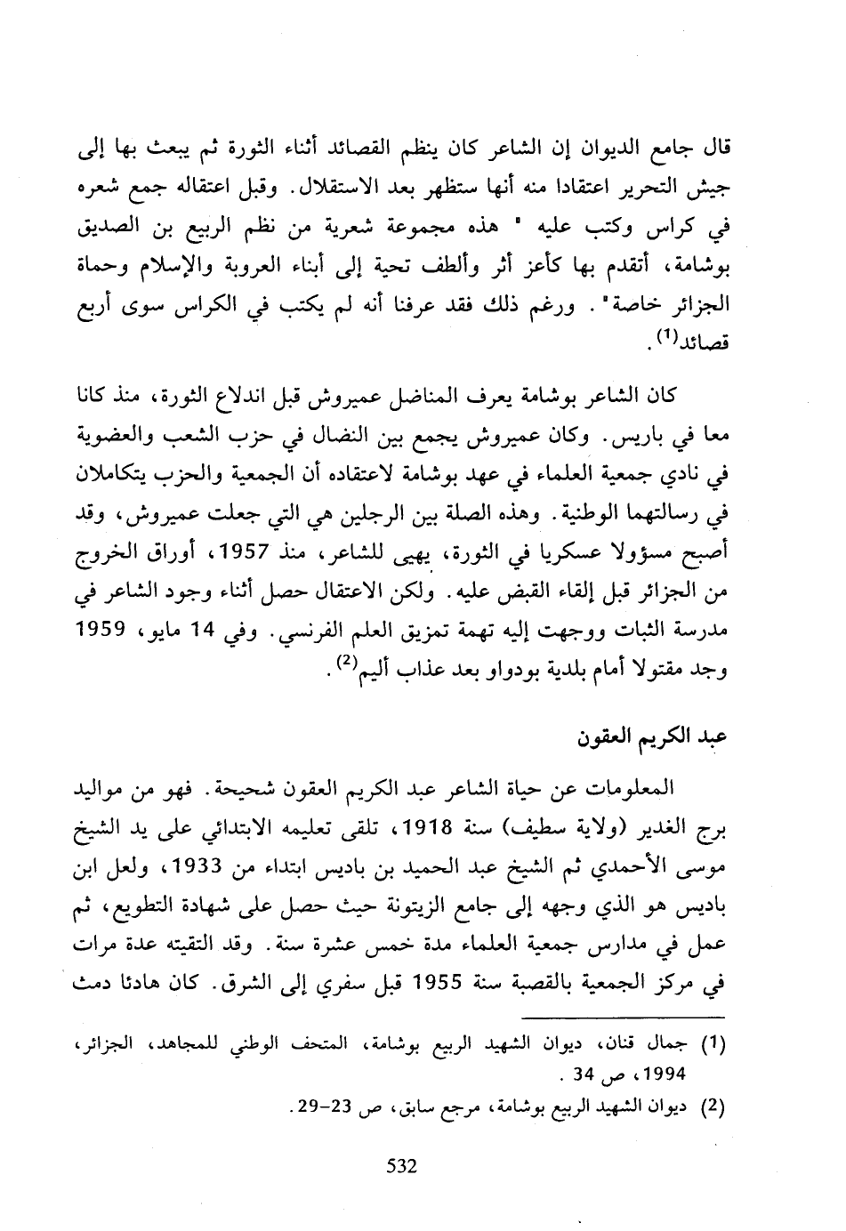 (1) جمال قنان، ديوان الشهيد الربيع بوشامة، المتحف الوطني للمجاهد، الجزائر، 1994، ص 34.