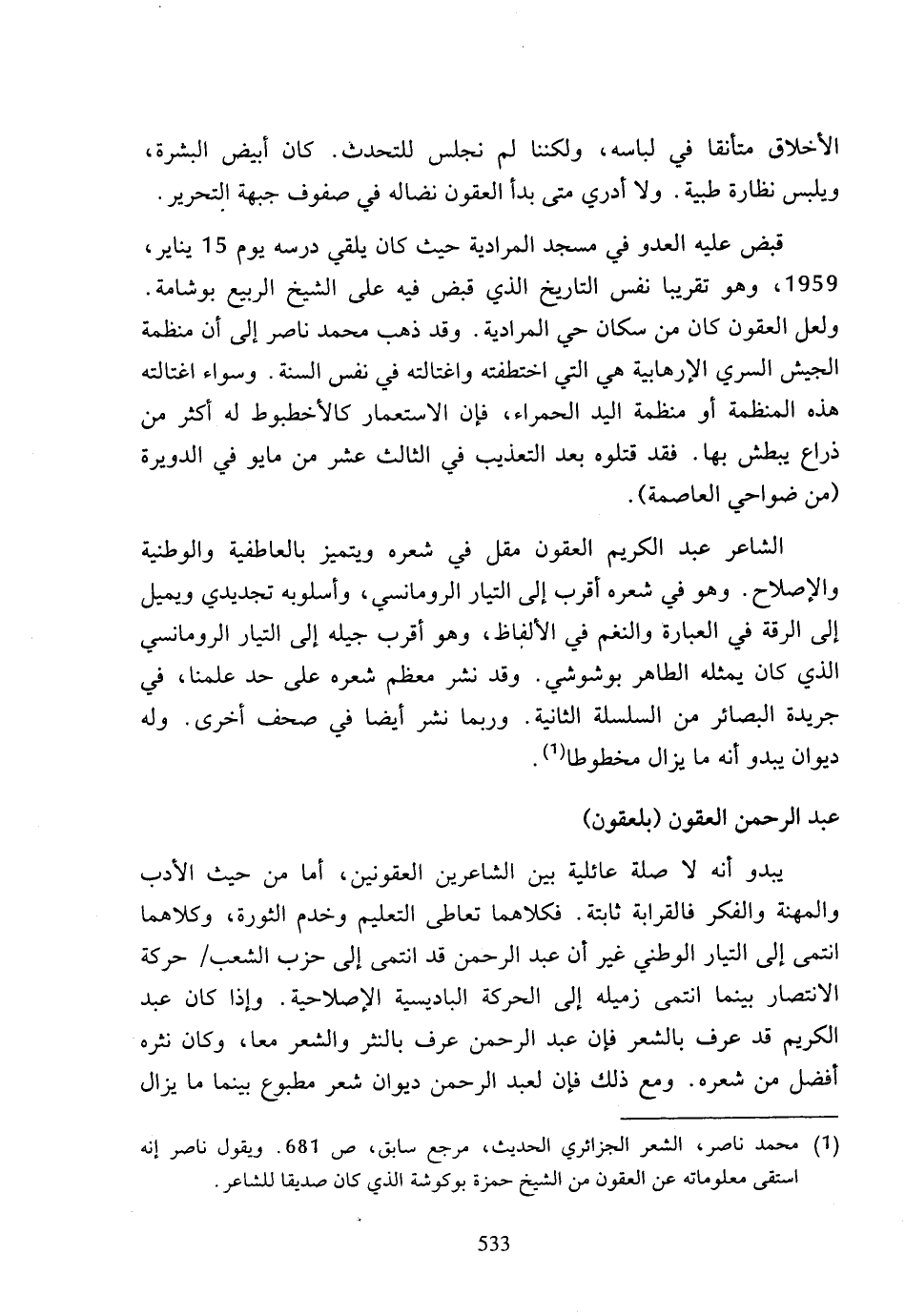(1) محمد ناصر، الشعر الجزائري الحديث، مرجع سابق، ص 681، ويقول ناصر إنه استقى معلوماته عن العقون من الشيخ حمزة بوكوشة الذي كان صديقا للشاعر.