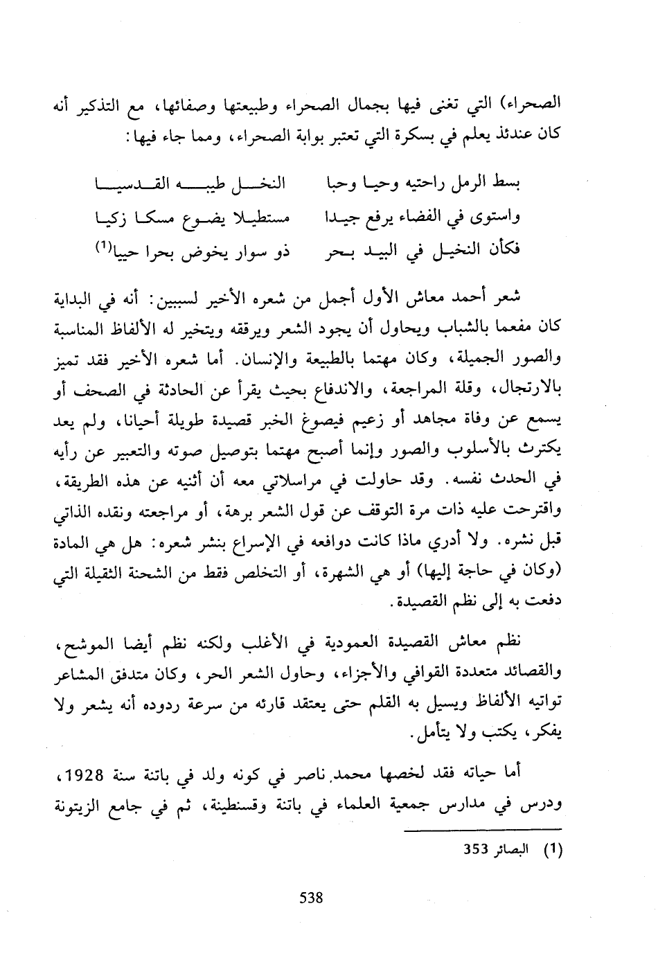 شعر أحمد معاش الأول أجمل من شعره الأخير لسببين: أنه في البداية كان مفعما بالشباب ويحاول أن يجود الشعر ويرققه ويتخير له الألفاظ المناسبة والصور الجميلة، وكان مهتما بالطبيعة والإنسان، أما شعره الأخير فقد تميز بالارتجال، وقلة المراجعة، والاندفاع بحيث يقرأ عن الحادثة في الصحف أو يسمع عن وفاة مجاهد أو زعيم فيصوغ الخبر قصيدة طويلة أحيانا، ولم يعد يكترث بالأسلوب والصور وإنما أصبح مهتما بتوصيل صوته والتعبير عن رأيه في الحدث نفسه، وقد حاولت في مراسلاتي معه أن أثنيه عن هذه الطريقة، واقترحت عليه ذات مرة التوقف عن قول الشعر برهة، أو مراجعته ونقده الذاتي قبل نشره، ولا أدري ماذا كانت دوافعه في الإسراع بنشر شعره: هل هي المادة (وكان في حاجة إليها) أو هي الشهرة، أو التخلص فقط من الشحنة الثقيلة التي دفعت به إلى نظم القصيدة.