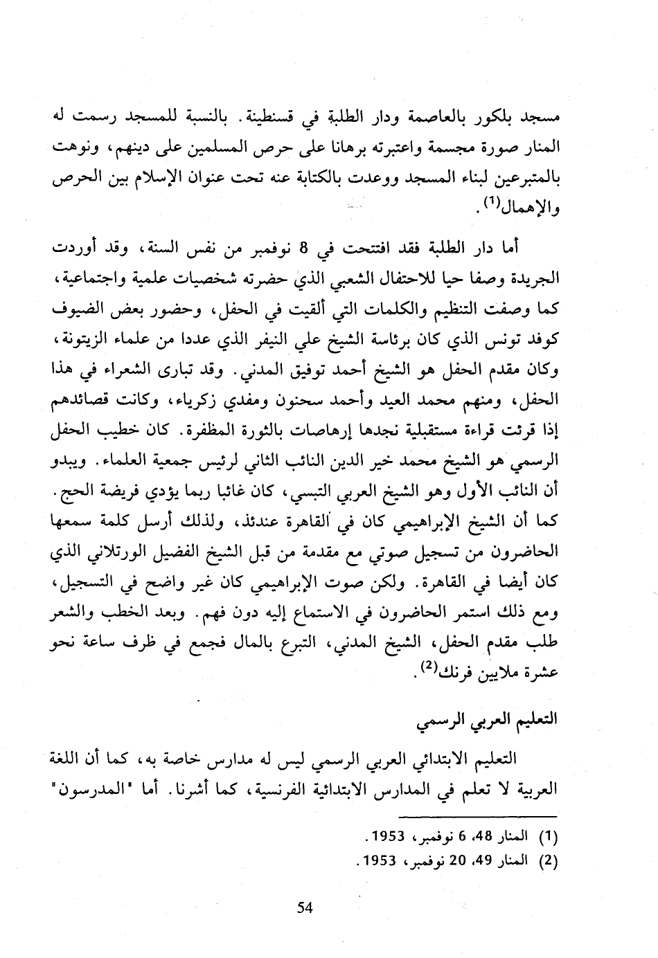 مسجد بلكور بالعاصمة ودار الطلبة في قسنطينة، بالنسبة للمسجد رسمت له المنار صورة مجسمة واعتبرته برهانا على حرص المسلمين على دينهم، ونوهت بالمتبرعين لبناء المسجد ووعدت بالكتابة عنه تحت عنوان الإسلام بين الحرص والإهمال (1).