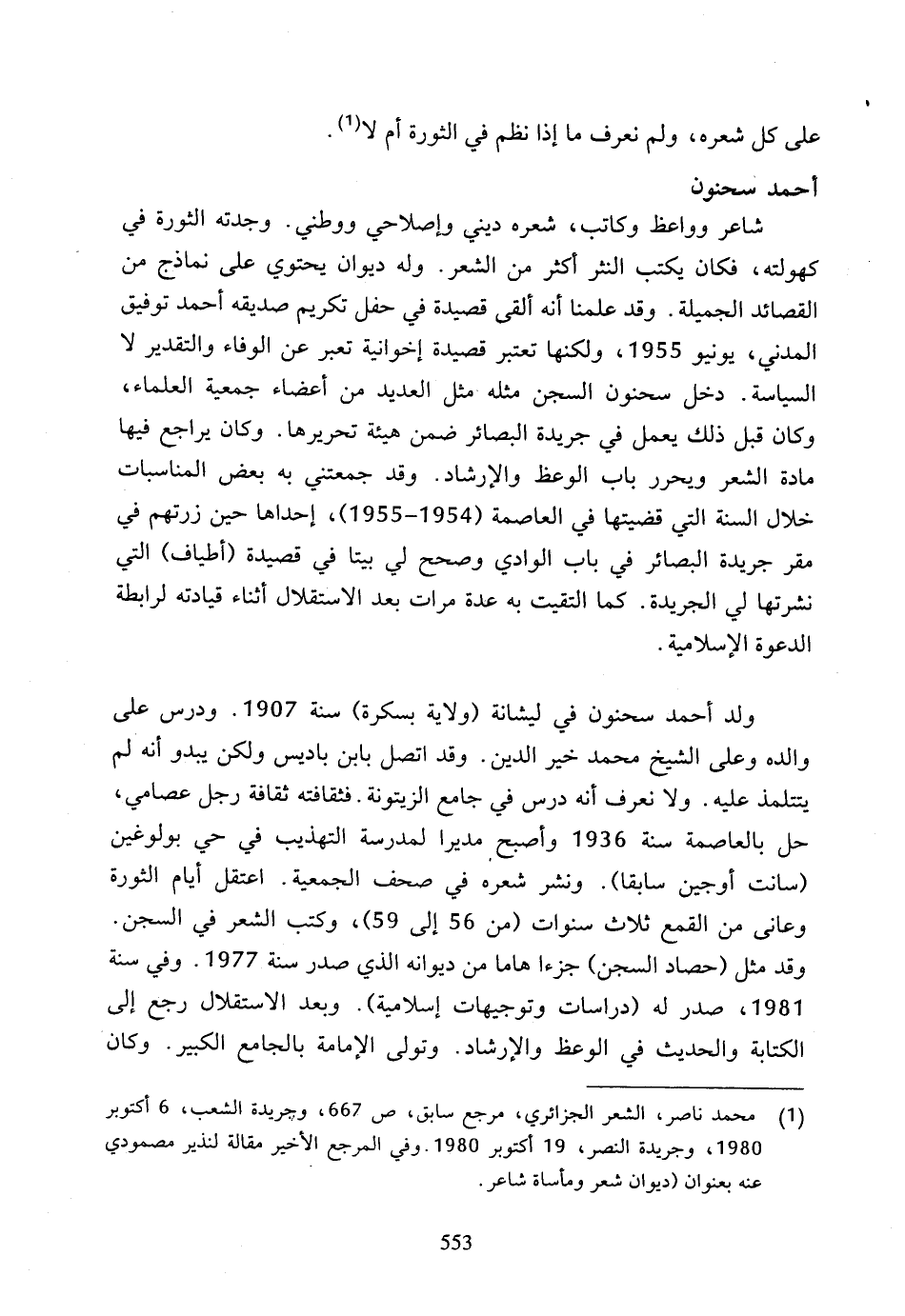 (1) محمد ناصر، الشعر الجزائري، مرجع سابق، ص 667، وجريدة الشعب، 6 أكتوبر 1980، وجريدة النصر، 19 أكتوبر 1980، وفي المرجع الأخير مقالة لنذير مصمودي عنه بعنوان (ديوان شعر ومأساة شاعر).