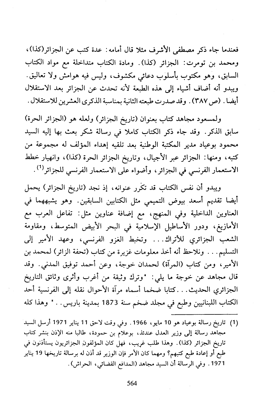 (1) تاريخ رسالة بوعياد هو 10 مايو، 1966، وفي وقت لاحق 11 يناير 1971 أرسل السيد مجاهد رسالة إلى وزير العدل عندئذ، بوعلام بن حمودة، طالبا منه الإذن بنشر كتاب تاريخ الجزائر (كذا)، وهذا طلب غريب، فهل كان المؤلفون الجزائريون يستأذنون في طبع أو إعادة طبع كتبهم؟ ومهما كان الأمر فإن الوزير قد أذن له برسالة تاريخها 19 يناير 1971، وفي الرسالة أن السيد مجاهد (المدافع القضائي، الحراش).