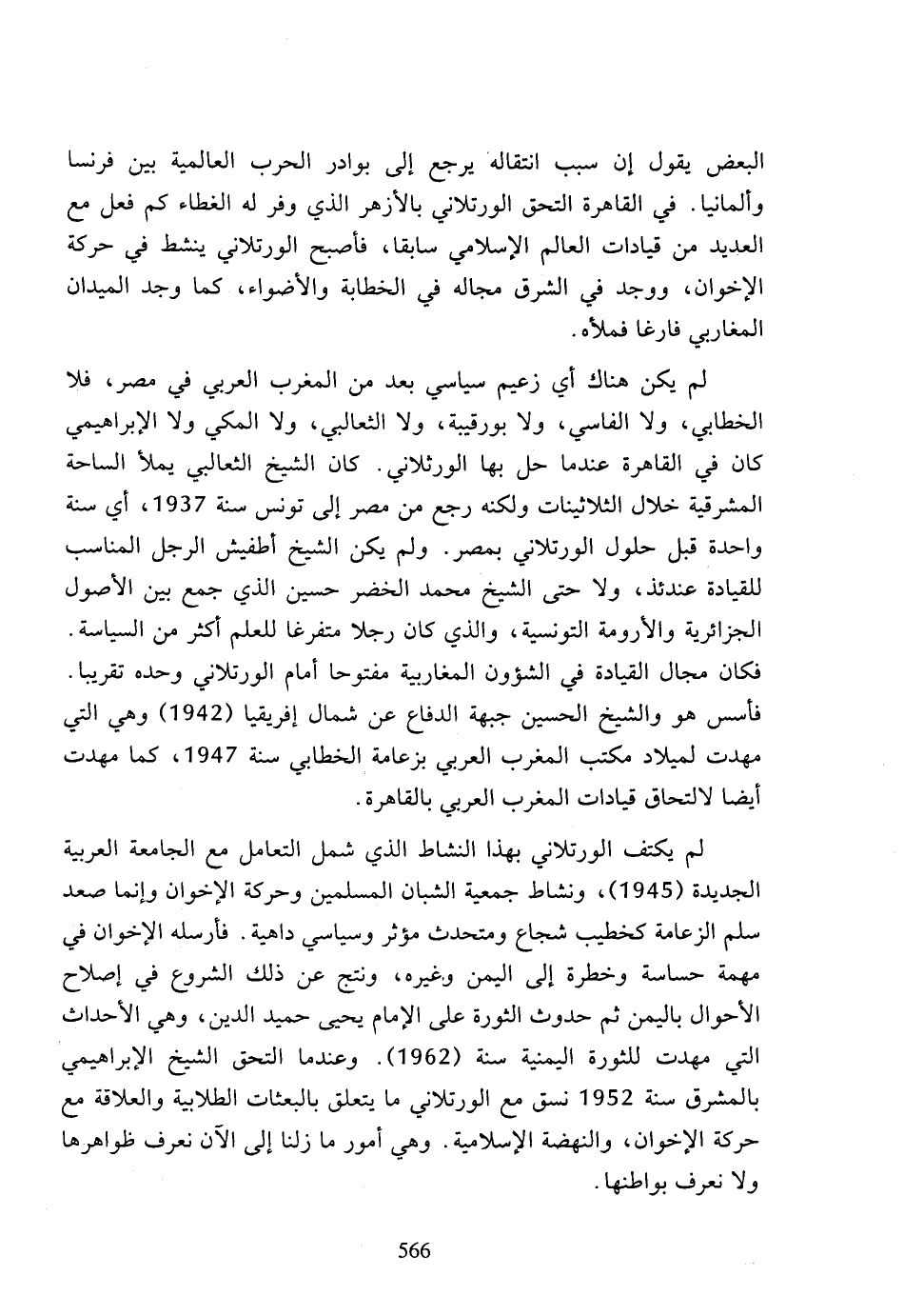 كان في القاهرة عندما حل بها الورثلاني، كان الشيخ الثعالبي يملأ الساحة المشرقية خلال الثلاثينات ولكنه رجع من مصر إلى تونس سنة 1937، أي سنة واحدة قبل حلول الورتلاني بمصر، ولم يكن الشيخ أطفيش الرجل المناسب للقيادة عندئذ، ولا حتى الشيخ محمد الخضر حسين الذي جمع بين الأصول الجزائرية والأرومة التونسية، والذي كان رجلا متفرغا للعلم أكثر من السياسة، فكان مجال القيادة في الشؤون المغاربية مفتوحا أمام الورتلاني وحده تقريبا، فأسس هو والشيخ الحسين جبهة الدفاع عن شمال إفريقيا (1942) وهي التي مهدت لميلاد مكتب المغرب العربي بزعامة الخطابي سنة 1947، كما مهدت أيضا لالتحاق قيادات المغرب العربي بالقاهرة.