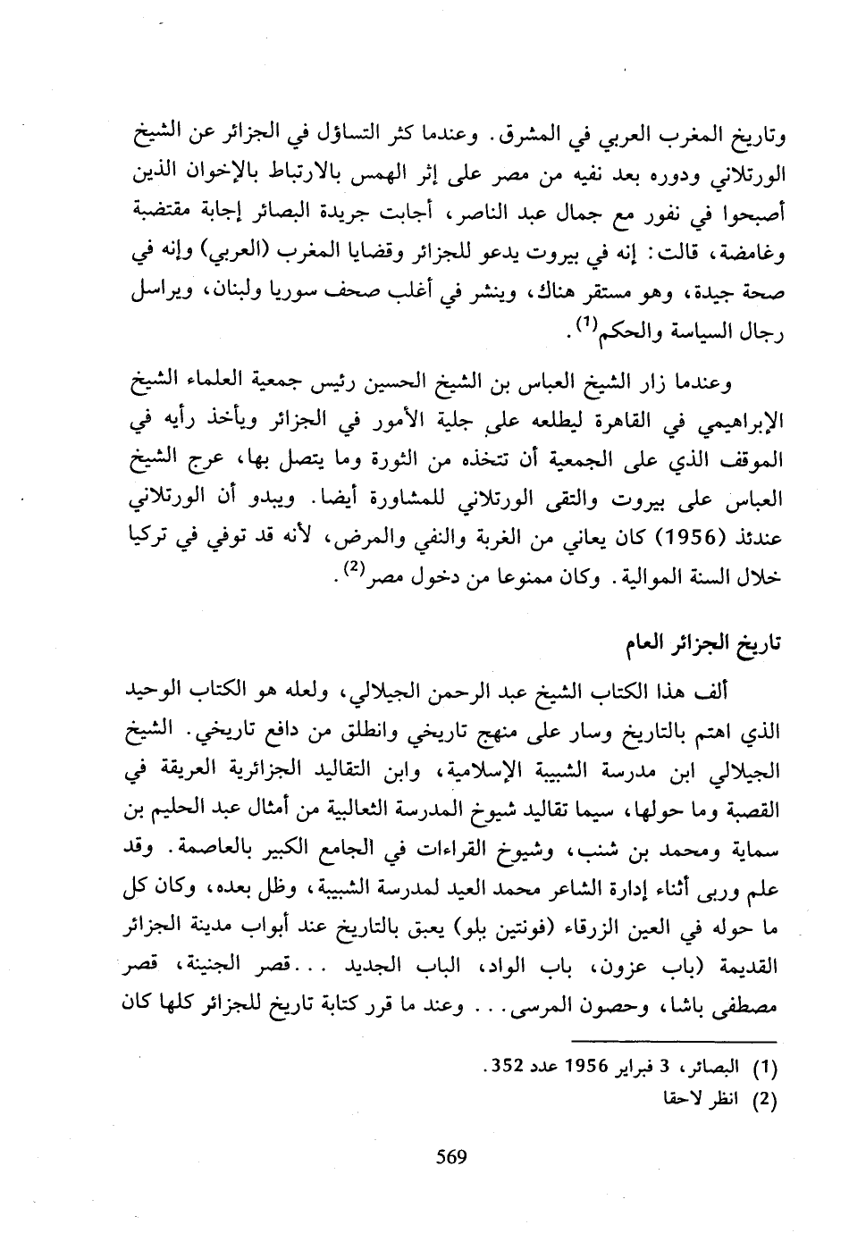 وتاريخ المغرب العربي في المشرق، وعندما كثر التساؤل في الجزائر عن الشيخ الورتلاني ودوره بعد نفيه من مصر على إثر الهمس بالارتباط بالإخوان الذين أصبحوا في نفور مع جمال عبد الناصر، أجابت جريدة البصائر إجابة مقتضبة وغامضة، قالت: إنه في بيروت يدعو للجزائر وقضايا المغرب (العربي) وإنه في صحة جيدة، وهو مستقر هناك، وينشر في أغلب صحف سوريا ولبنان، ويراسل رجال السياسة والحكم (1).