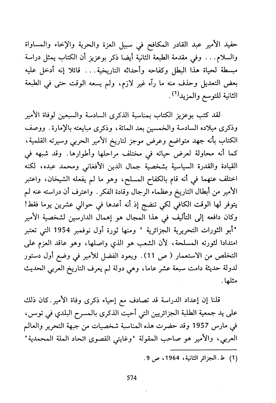 حفيد الأمير عبد القادر المكافح في سبيل العزة والحرية والإخاء والمساواة والسلام ... وفي مقدمة الطبعة الثانية أيضا ذكر بوعزيز أن الكتاب يمثل دراسة مبسطة لحياة هذا البطل وكفاحه وأحداثه التاريخية ... قائلا إنه أدخل عليه بعض التعديل وحذف منه ما رآه غير لازم، ولم يسعه الوقت حتى في الطبعة الثانية للتوسع والمزيد (1).