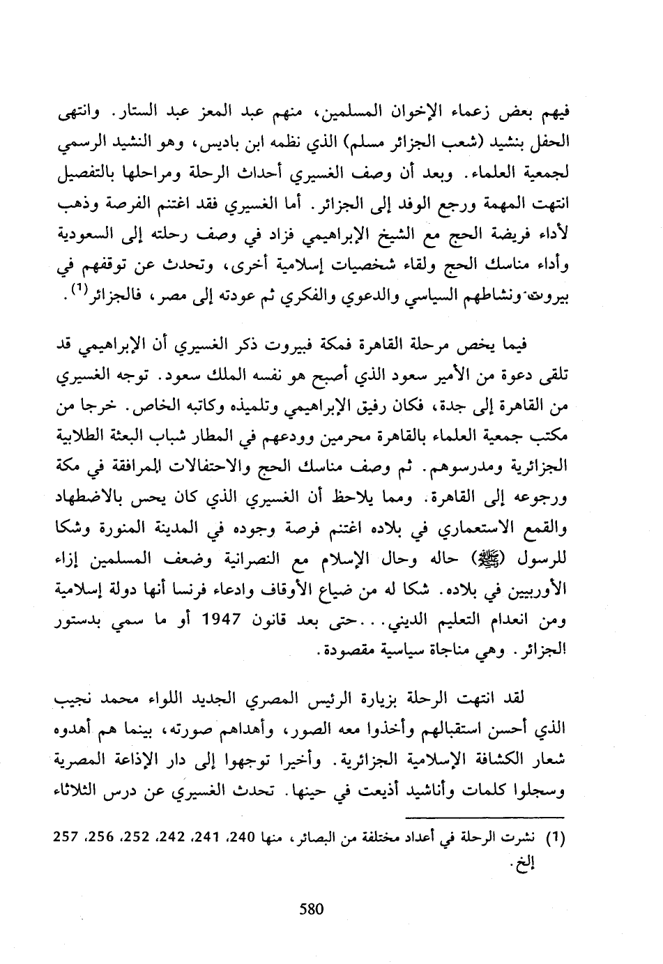 فيهم بعض زعماء الإخوان المسلمين، منهم عبد المعز عبد الستار، وانتهى الحفل بنشيد (شعب الجزائر مسلم) الذي نظمه ابن باديس، وهو النشيد الرسمي لجمعية العلماء، وبعد أن وصف الغسيري أحداث الرحلة ومراحلها بالتفصيل انتهت المهمة ورجع الوفد إلى الجزائر، أما الغسيري فقد اغتنم الفرصة وذهب لأداء فريضة الحج مع الشيخ الإبراهيمي فزاد في وصف رحلته إلى السعودية وأداء مناسك الحج ولقاء شخصيات إسلامية أخرى، وتحدث عن توقفهم في بيروت ونشاطهم السياسي والدعوى والفكري ثم عودته إلى مصر، فالجزائر (1).