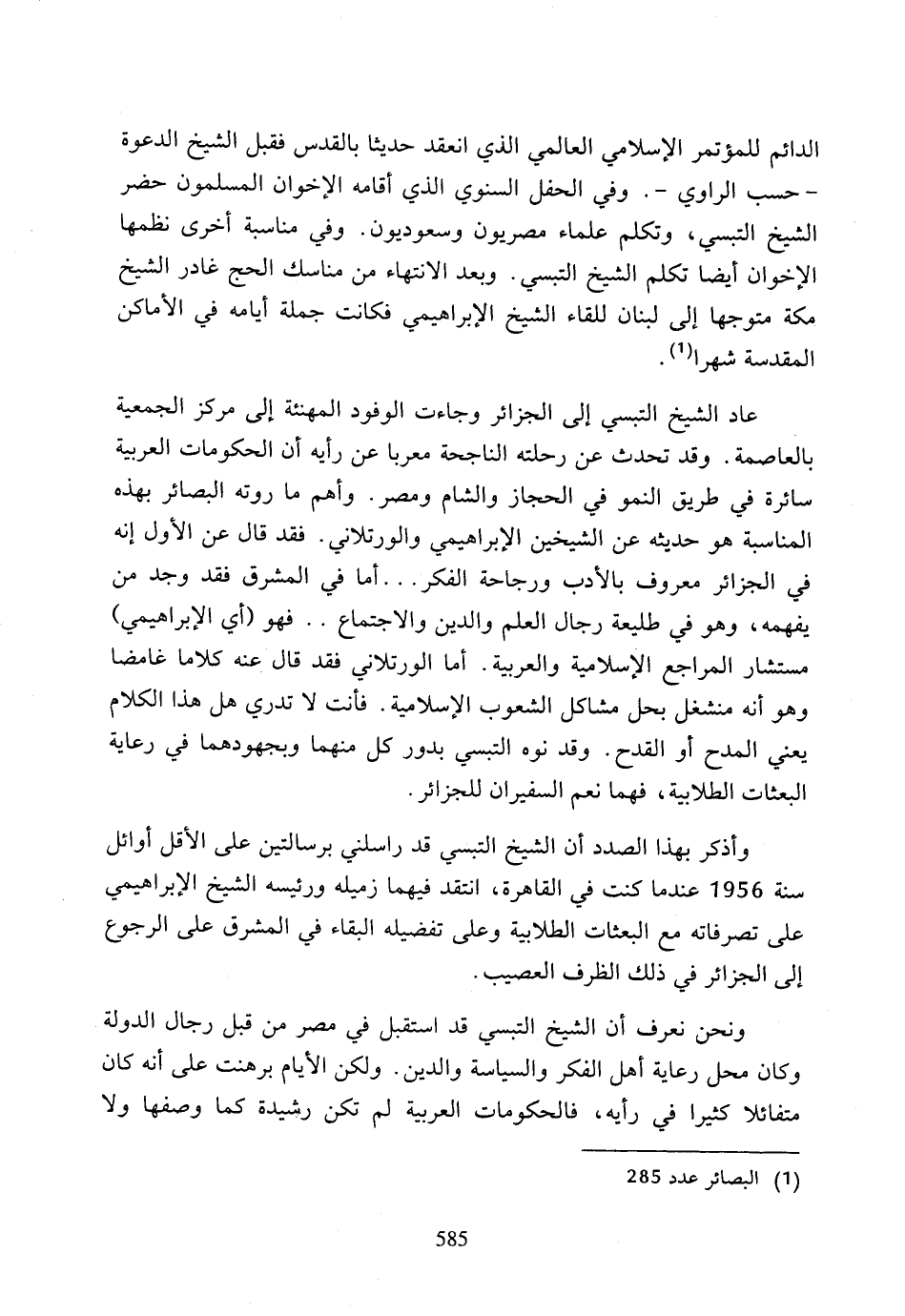 وأذكر بهذا الصدد أن الشيخ التبسي قد راسلني برسالتين على الأقل أوائل سنة 1956 عندما كنت في القاهرة، انتقد فيهما زميله ورئيسه الشيخ الإبراهيمي على تصرفاته مع البعثات الطلابية وعلى تفضيله البقاء في المشرق على الرجوع إلى الجزائر في ذلك الظرف العصيب.