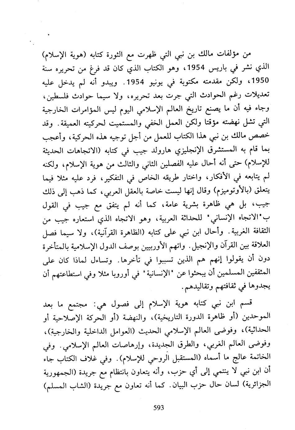 من مؤلفات مالك بن نبي التي ظهرت مع الثورة كتابه (هوية الإسلام) الذي نشر في باريس 1954، وهو الكتاب الذي كان قد فرغ من تحريره سنة 1950، ولكن مقدمته مكتوبة في يونيو 1954، ويبدو أنه لم يدخل عليه تعديلات رغم الحوادث التي جرت بعد تحريره، ولا سيما حوادث فلسطين، وجاء فيه أن ما يصنع تاريخ العالم الإسلامي اليوم ليس المؤامرات الخارجية التي تشل نهضته مؤقتا ولكن العمل الخفي والمستميت لحركيته العميقة، وقد خصص مالك بن نبي هذا الكتاب للعمل من أجل توجيه هذه الحركية، وأعجب بما قام به المستشرق الإنجليزي هارولد جيب في كتابه (الاتجاهات الحديثة للإسلام) حتى أنه أحال عليه الفصلين الثاني والثالث من هوية الإسلام، ولكنه لم يتابعه في الأفكار، واختار طريقه الخاص في التفكير، فرد عليه مثلا فيما يتعلق (بالأوتوميزم) وقال إنها ليست خاصة بالعقل العربي، كما ذهب إلى ذلك جيب، بل هي ظاهرة بشرية عامة، كما أنه لم يتفق مع جيب في القول بـ (الاتجاه الإنساني) للحداثة العربية، وهو الاتجاه الذي استعاره جيب من الثقافة الغربية، وأحال ابن نبي على كتابه (الظاهرة القرآنية)، ولا سيما فصل العلاقة بين القرآن والإنجيل، واتهم الأوربيين بوصف الدول الإسلامية بالمتأخرة دون أن يقولوا إنهم هم الذين تسببوا في تأخرها، وتساءل لماذا كان على المثقفين المسلمين أن يبحثوا عن (الإنسانية) في أوروبا مثلا وفي استطاعتهم أن يجدوها في ثقافتهم وتقاليدهم.