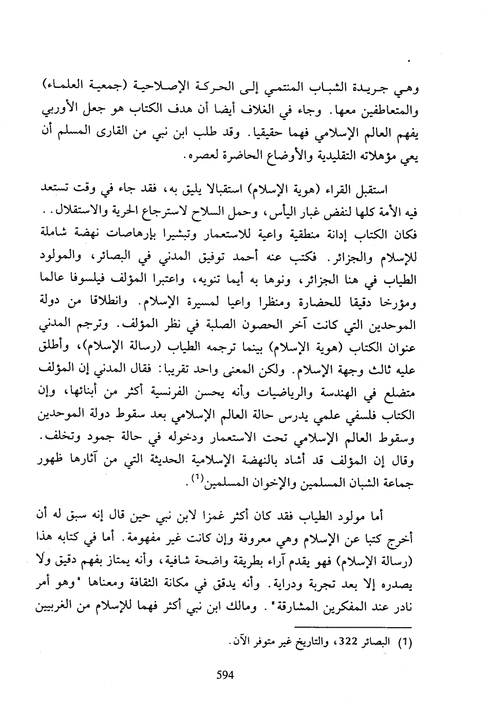 أما مولود الطياب فقد كان أكثر غمزا لابن نبي حين قال إنه سبق له أن أخرج كتبا عن الإسلام وهي معروفة وإن كانت غير مفهومة، أما في كتابه هذا (رسالة الإسلام) فهو يقدم آراء بطريقة واضحة شافية، وأنه يمتاز بفهم دقيق ولا يصدره إلا بعد تجربة ودراية، وأنه يدقق في مكانة الثقافة ومعناها (وهو أمر نادر عند المفكرين المشارقة)، ومالك ابن نبي أكثر فهما للإسلام من الغربيين