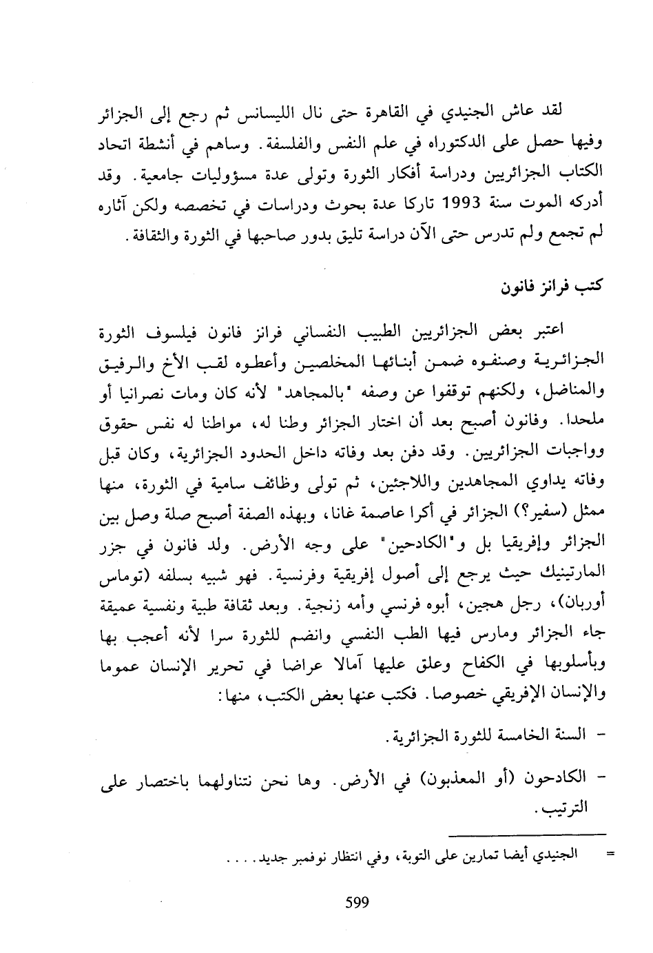 اعتبر بعض الجزائريين الطبيب النفساني فرانز فانون فيلسوف الثورة الجزائرية وصنفوه ضمن أبنائها المخلصين وأعطوه لقب الأخ والرفيق والمناضل، ولكنهم توقفوا عن وصفه (بالمجاهد) لأنه كان ومات نصرانيا أو ملحدا، وفانون أصبح بعد أن اختار الجزائر وطنا له، مواطنا له نفس حقوق وواجبات الجزائريين، وقد دفن بعد وفاته داخل الحدود الجزائرية، وكان قبل وفاته يداوي المجاهدين واللاجئين، ثم تولى وظائف سامية في الثورة، منها ممثل (سفير؟) الجزائر في أكرا عاصمة غانا، وبهذه الصفة أصبح صلة وصل بين الجزائر وإفريقيا بل و (الكادحين) على وجه الأرض، ولد فانون في جزر المارتينيك حيث يرجع إلى أصول إفريقية وفرنسية، فهو شبيه بسلفه (توماس أوربان)، رجل هجين، أبوه فرنسي وأمه زنجية، وبعد ثقافة طبية ونفسية عميقة جاء الجزائر ومارس فيها الطب النفسي وانضم للثورة سرا لأنه أعجب بها وبأسلوبها في الكفاح وعلق عليها آمالا عراضا في تحرير الإنسان عموما والإنسان الإفريقي خصوصا، فكتب عنها بعض الكتب، منها: