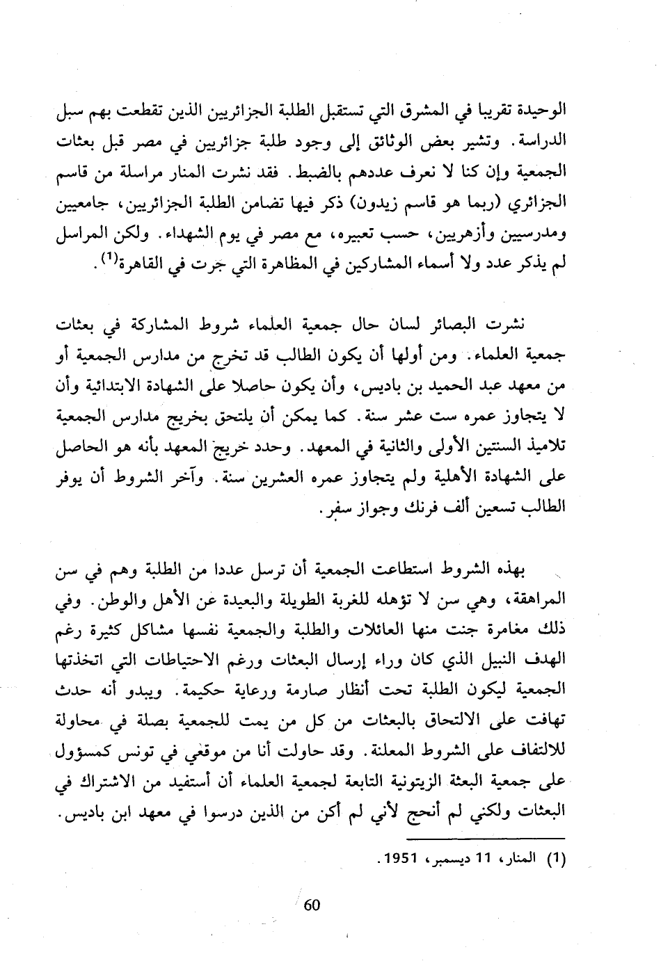 بهذه الشروط استطاعت الجمعية أن ترسل عددا من الطلبة وهم في سن المراهقة، وهي سن لا تؤهله للغربة الطويلة والبعيدة عن الأهل والوطن، وفي ذلك مغامرة جنت منها العائلات والطلبة والجمعية نفسها مشاكل كثيرة رغم الهدف النبيل الذي كان وراء إرسال البعثات ورغم الاحتياطات التي اتخذتها الجمعية ليكون الطلبة تحت أنظار صارمة ورعاية حكيمة، ويبدو أنه حدث تهافت على الالتحاق بالبعثات من كل من يمت للجمعية بصلة في محاولة للالتفاف على الشروط المعلنة، وقد حاولت أنا من موقعي في تونس كمسؤول على جمعية البعثة الزيتونية التابعة لجمعية العلماء أن أستفيد من الاشتراك في البعثات ولكني لم أنجح لأني لم أكن من الذين درسوا في معهد ابن باديس.