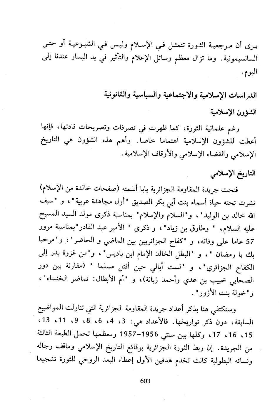 وسنكتفي هنا بذكر أعداد جريدة المقاومة الجزائرية التي تناولت المواضيع السابقة، دون ذكر تواريخها، فالأعداد هي: 3، 4، 6، 8، 9، 11، 13، 15، 16، 17، وكلها بين سنتي 1956 - 1957 ومعظمها تحمل الطبعة الثالثة من الجريدة، إن ربط الثورة الجزائرية بوقاشع التاريخ الإسلامي ومواقف رجاله ونسائه البطولية كانت تخدم هدفين الأول إعطاء البعد الروحي للثورة تشجيعا
