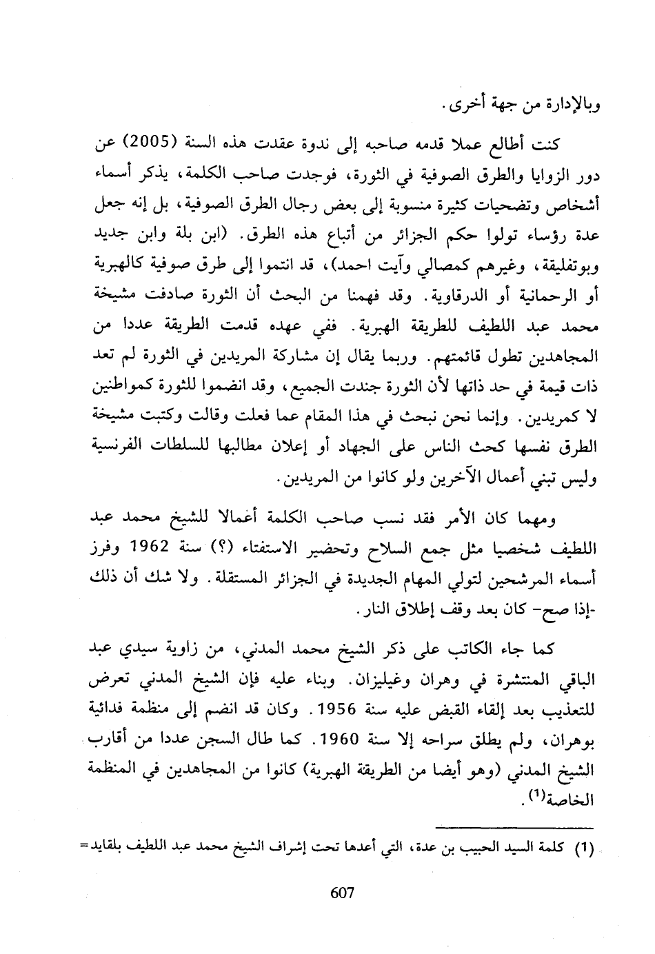 كنت أطالع عملا قدمه صاحبه إلى ندوة عقدت هذه السنة (2005) عن دور الزوايا والطرق الصوفية في الثورة، فوجدت صاحب الكلمة، يذكر أسماء أشخاص وتضحيات كثيرة منسوبة إلى بعض رجال الطرق الصوفية، بل إنه جعل عدة رؤساء تولوا حكم الجزائر من أتباع هذه الطرق، (ابن بلة وابن جديد وبوتفليقة، وغيرهم كمصالي وآيت احمد)، قد انتموا إلى طرق صوفية كالهبرية أو الرحمانية أو الدرقاوية، وقد فهمنا من البحث أن الثورة صادفت مشيخة محمد عبد اللطيف للطريقة الهبرية، ففي عهده قدمت الطريقة عددا من المجاهدين تطول قائمتهم، وربما يقال إن مشاركة المريدين في الثورة لم تعد ذات قيمة في حد ذاتها لأن الثورة جندت الجميع، وقد انضموا للثورة كمواطنين لا كمريدين، وإنما نحن نبحث في هذا المقام عما فعلت وقالت وكتبت مشيخة الطرق نفسها كحث الناس على الجهاد أو إعلان مطالبها للسلطات الفرنسية وليس تبني أعمال الآخرين ولو كانوا من المريدين.