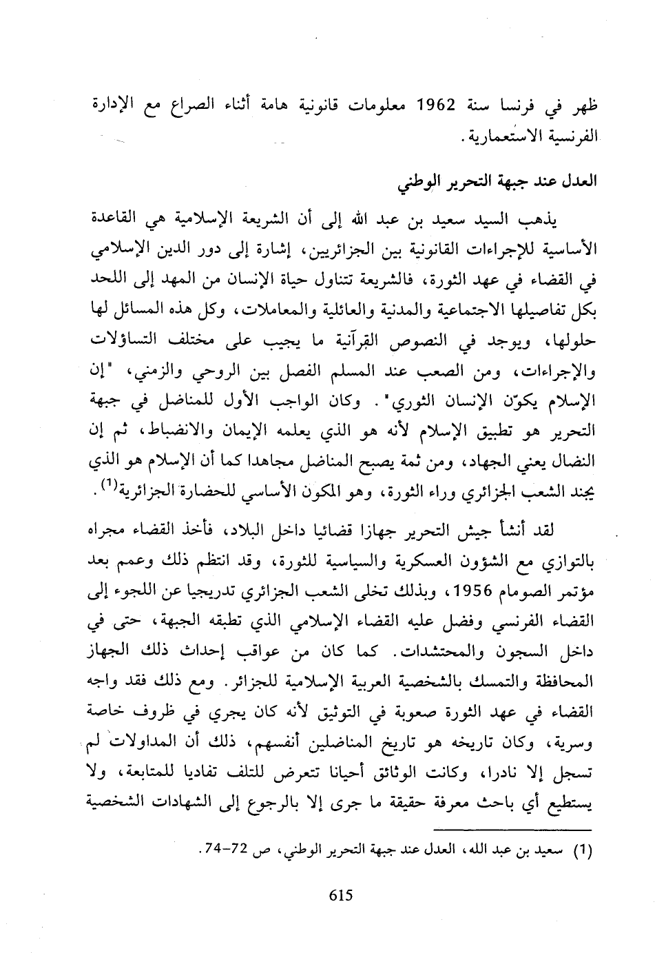 (1) سعيد بن عبد الله، العدل عند جبهة التحرير الوطني، ص 72 - 74.