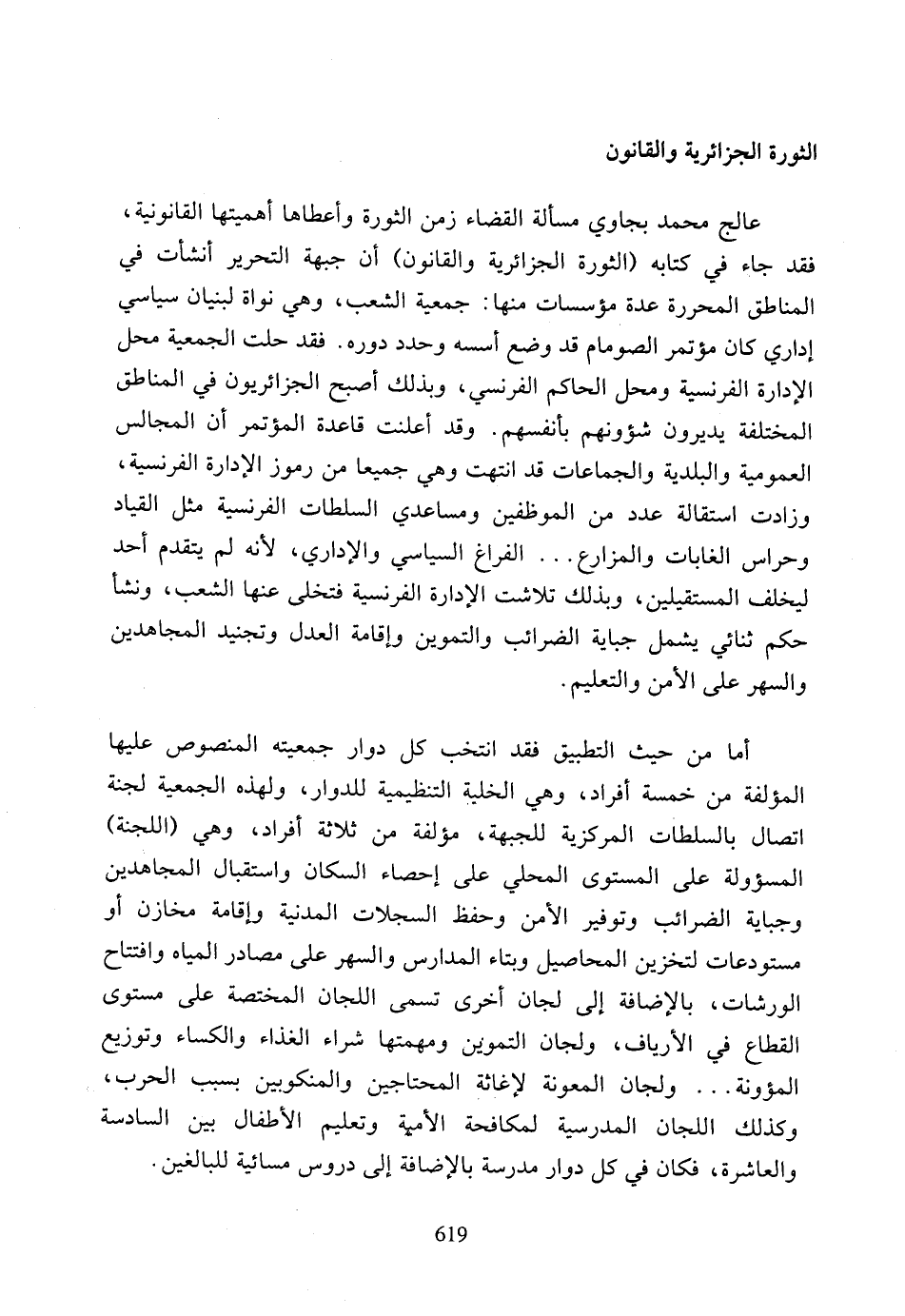 عالج محمد بجاوي مسألة القضاء زمن الثورة وأعطاها أهميتها القانونية، فقد جاء في كتابه (الثورة الجزائرية والقانون) أن جبهة التحرير أنشأت في المناطق المحررة عدة مؤسسات منها: جمعية الشعب، وهي نواة لبنيان سياسي إداري كان مؤتمر الصومام قد وضع أسسه وحدد دوره، فقد حلت الجمعية محل الإدارة الفرنسية ومحل الحاكم الفرنسي، وبذلك أصبح الجزائريون في المناطق المختلفة يديرون شؤونهم بأنفسهم، وقد أعلنت قاعدة المؤتمر أن المجالس العمومية والبلدية والجماعات قد انتهت وهي جميعا من رموز الإدارة الفرنسية، وزادت استقالة عدد من الموظفين ومساعدي السلطات الفرنسية مثل القياد وحراس الغابات والمزارع ... الفراغ السياسي والإداري، لأنه لم يتقدم أحد ليخلف المستقيلين، وبذلك تلاشت الإدارة الفرنسية فتخلى عنها الشعب، ونشأ حكم ثناني يشمل جباية الضرائب والتموين وإقامة العدل وتجنيد المجاهدين والسهر على الأمن والتعليم.
