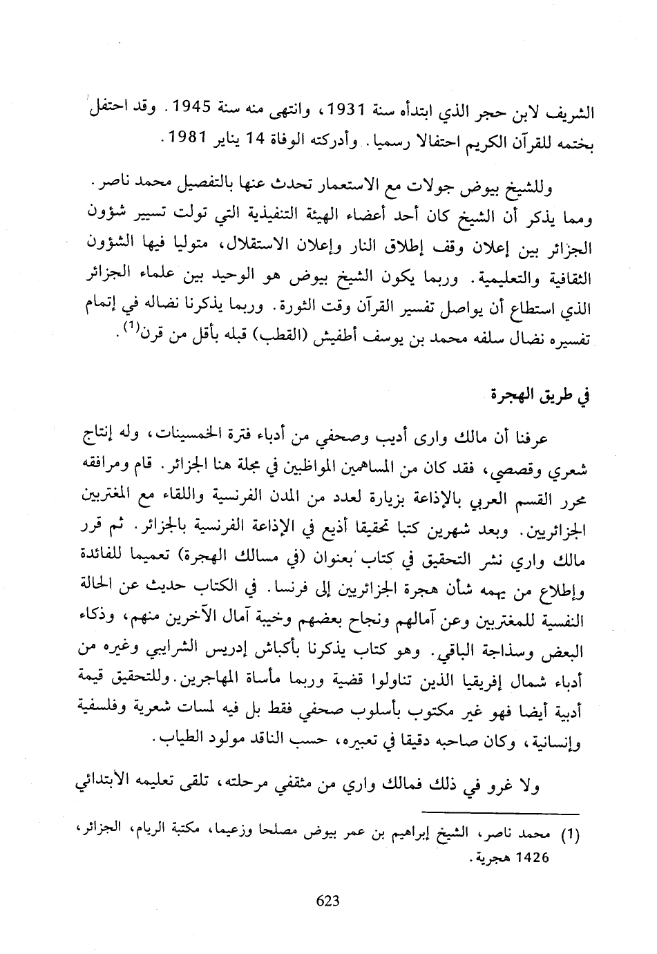 (1) محمد ناصر، الشيخ إبراهيم بن عمر بيوض مصلحا وزعيما، مكتبة الريام، الجزائر، 1426 هجرية.