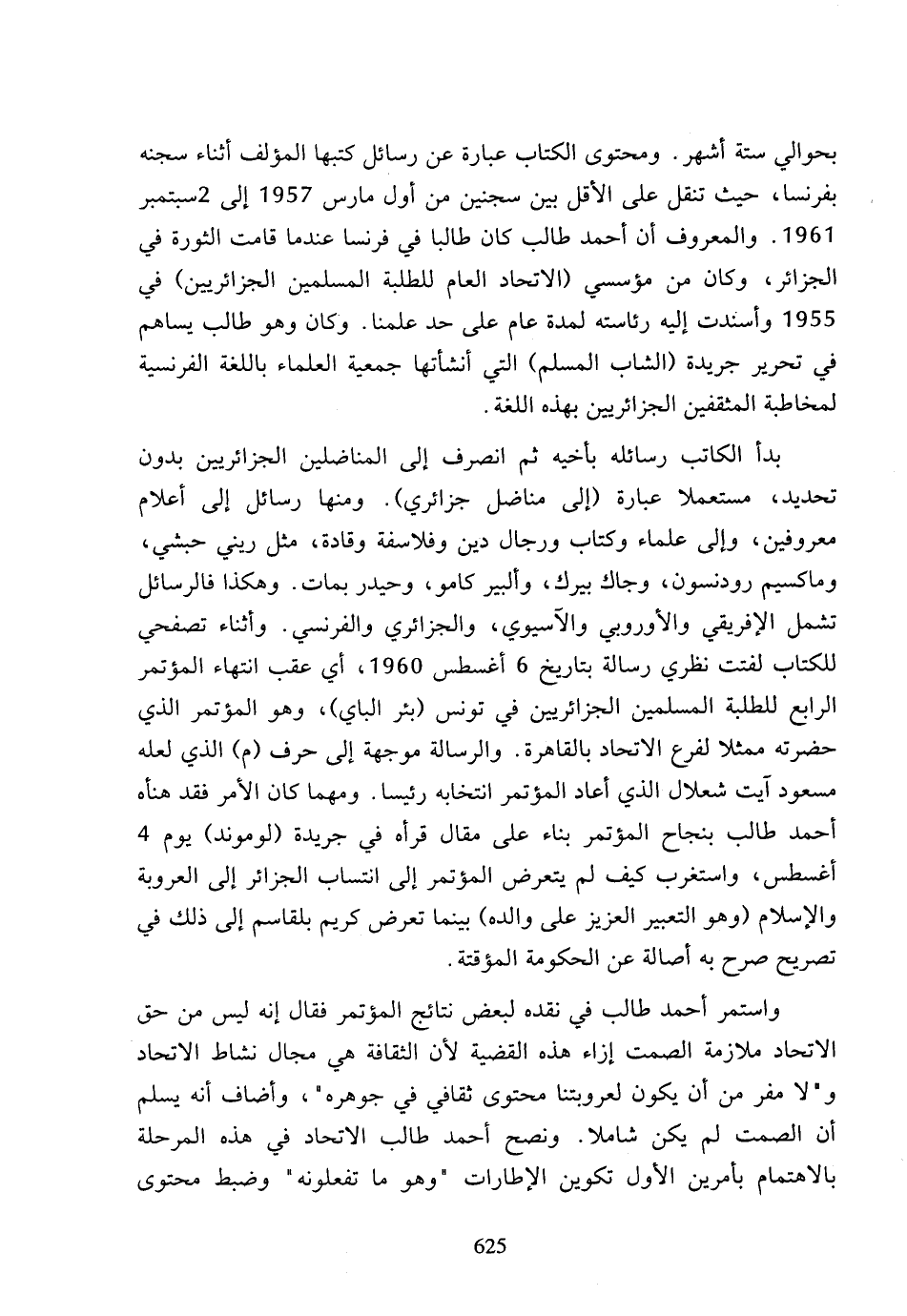 بدأ الكاتب رسائله بأخيه ثم انصرف إلى المناضلين الجزائريين بدون تحديد، مستعملا عبارة (إلى مناضل جزائري)، ومنها رسائل إلى أعلام معروفين، وإلى علماء وكتاب ورجال دين وفلاسفة وقادة، مثل ريني حبشي. وماكسيم رودنسون، وجاك بيرك، وألبير كامو، وحيدر بمات، وهكذا فالرسائل تشمل الإفريقي والأوروبي والآسيوي، والجزائري والفرنسي، وأثناء تصفحي للكتاب لفتت نظري رسالة بتاريخ 6 أغسطس 1960، أي عقب انتهاء المؤتمر الرابع للطلبة المسلمين الجزائريين في تونس (بئر الباي)، وهو المؤتمر الذي حضرته ممثلا لفرع الاتحاد بالقاهرة، والرسالة موجهة إلى حرف (م) الذي لعله مسعود آيت شعلال الذي أعاد المؤتمر انتخابه رئيسا، ومهما كان الأمر فقد هنأه أحمد طالب بنجاح المؤتمر بناء على مقال قرأه في جريدة (لوموند) يوم 4 أغسطس، واستغرب كيف لم يتعرص المؤتمر إلى انتساب الجزائر إلى العروبة والإسلام (وهو التعبير العزيز على والده) بينما تعرض كريم بلقاسم إلى ذلك في تصريح صرح به أصالة عن الحكومة المؤقتة.