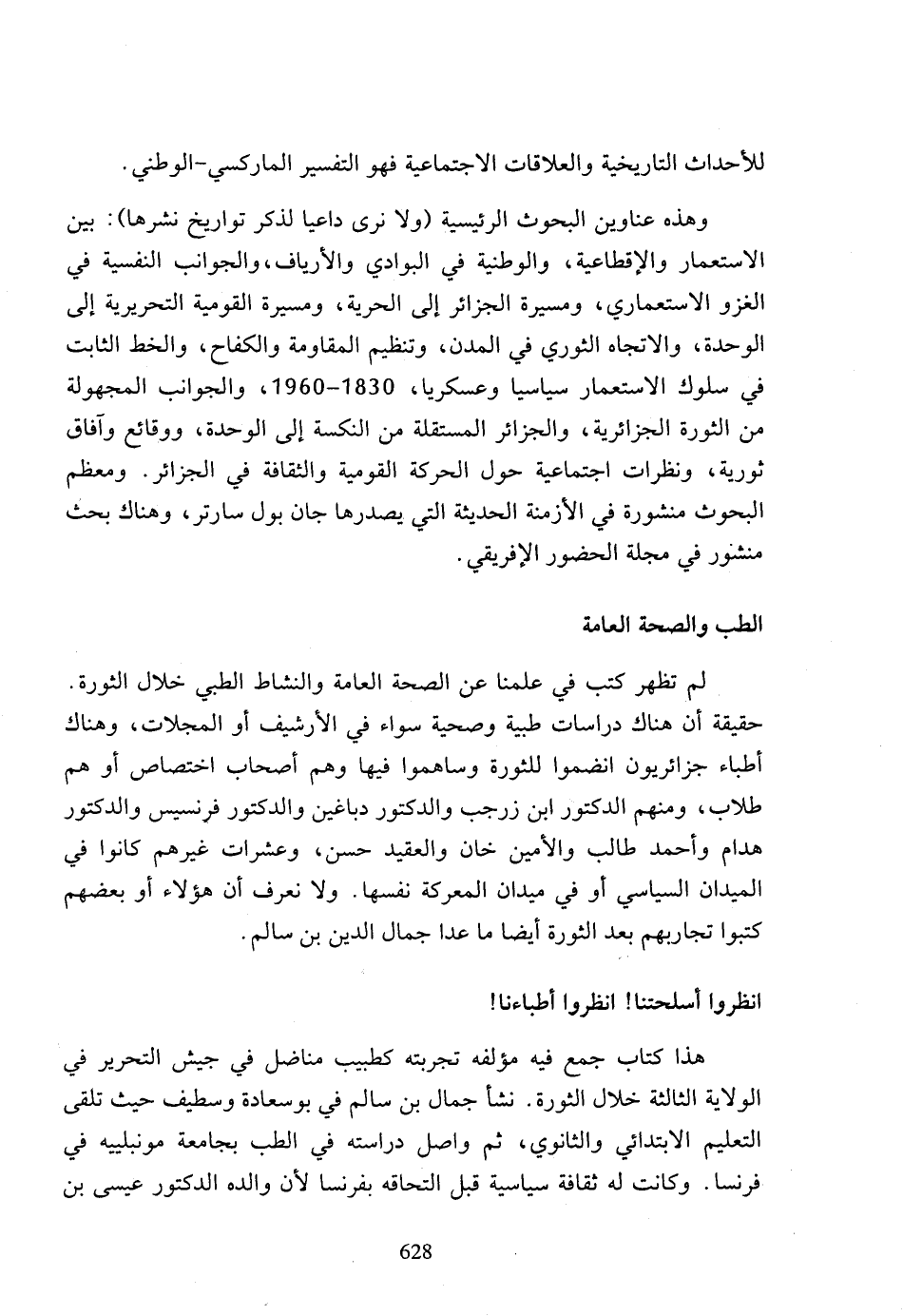 لم تظهر كتب في علمنا عن الصحة العامة والنشاط الطبي خلال الثورة. حقيقة أن هناك دراسات طبية وصحية سواء في الأرشيف أو المجلات، وهناك أطباء جزائريون انضموا للثورة وساهموا فيها وهم أصحاب اختصاص أو هم طلاب، ومنهم الدكتور ابن زرجب والدكتور دباغين والدكتور فرنسيس والدكتور هدام وأحمد طالب والأمين خان والعقيد حسن، وعشرات غيرهم كانوا في الميدان السياسي أو في ميدان المعركة نفسها، ولا نعرف أن هؤلاء أو بعضهم كتبوا تجاربهم بعد الثورة أيضا ما عدا جمال الدين بن سالم.