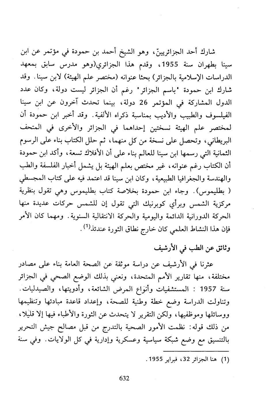 شارك أحد الجزائريين، وهو الشيخ أحمد بن حمودة في مؤتمر عن ابن سينا بطهران سنة 1955، وقدم هذا الجزائري (وهو مدرس سابق بمعهد الدراسات الإسلامية بالجزائر) بحثا عنوانه (مختصر علم الهيئة) لابن سينا، وقد شارك ابن حمودة (باسم الجزائر) رغم أن الجزائر ليست دولة، وكان عدد الدول المشاركة في المؤتمر 26 دولة، بيتما تحدث آخرون عن ابن سينا الفيلسوف والطبيب والأديب بمناسبة ذكراه الألفية، وقد أخبر ابن حمودة أن لمختصر علم الهيئة نسختين إحداهما في الجزائر والأخرى في المتحف البريطاني، وتحصل على نسخة من كل منهما، ثم حلل الكتاب بناء على الرسوم الثمانية التي رسمها ابن سينا للعالم بناء على أن الأفلاك تسعة، وأكد ابن حمودة أن الكتاب رغم عنوانه، غير مختص بعلم الهيئة بل يشمل أخبار الفلسفة والطب والهندمة والجغرافيا الطبيعية، وكان ابن سينا قد اعتمد فيه على كتاب المجسطي (بطليموس)، وجاء ابن حمودة بخلاصة كتاب بطليموس وهي تقول بنظرية مركزية الشمس وبرأي كوبرنيك التي تقول إن للشمس حركات عديدة منها الحركة الدورانية الدائمة واليومين والحركة الانتقالية السنوية، ومهما كان الأمر فإن هذا النشاط العلمي كان خارج نطاق الثورة عندئذ (1).