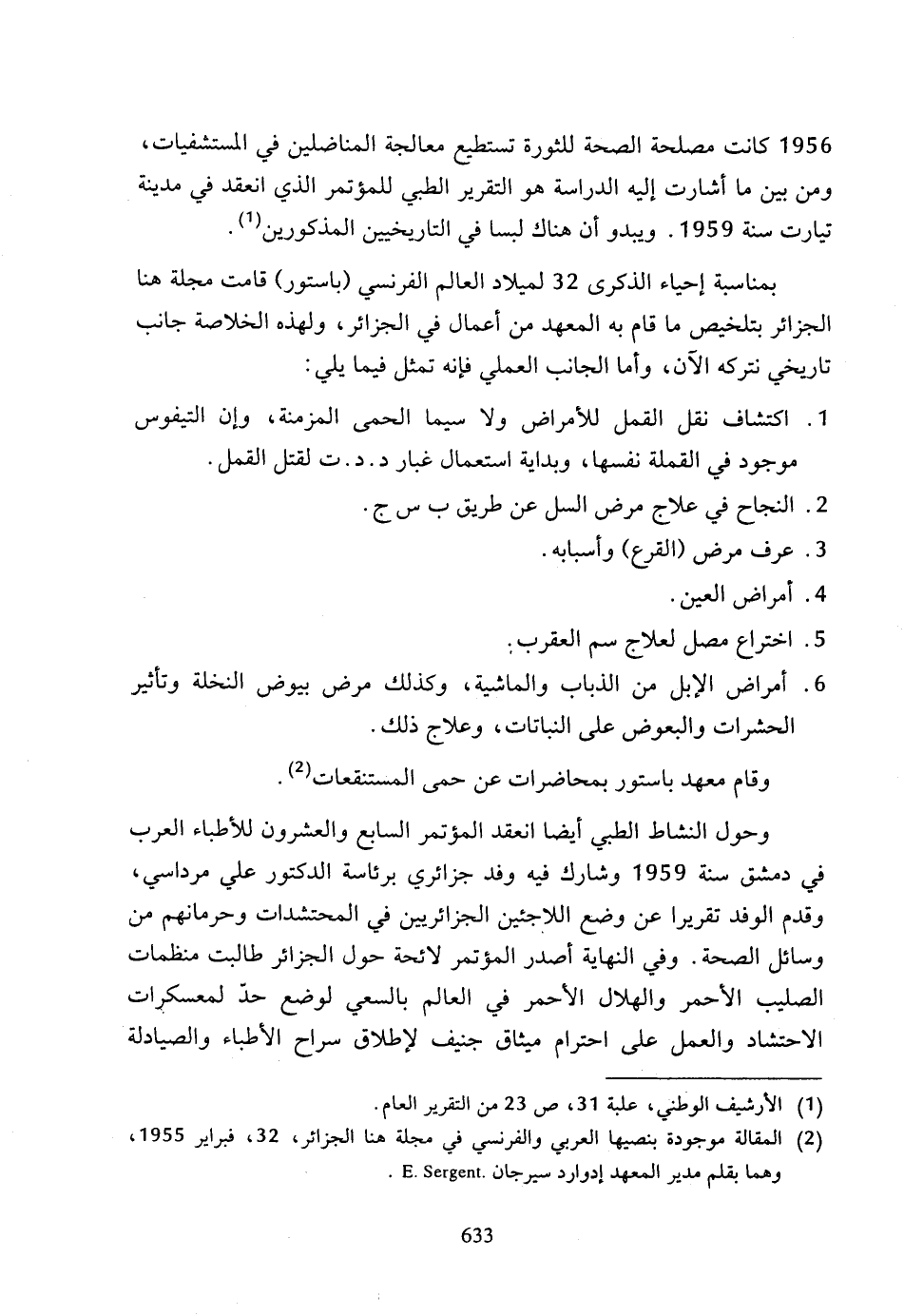(2) المقالة موجودة بنصيها العربي والفرنسي في مجلة هنا الجزائر، 32، فبراير 1955، وهما بقلم مدير المعهد إدوارد سيرجان E.Sergent