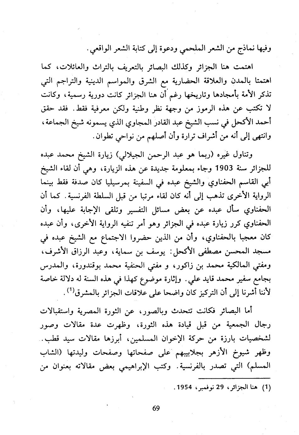 وتناول غيره (ربما هو عبد الرحمن الجيلالي) زيارة الشيخ محمد عبده للجزائر سنة 1903 وجاء بمعلومة جديدة عن هذه الزيارة، وهي أن لقاء الشيخ أبي القاسم الحفناوي والشيخ عبده في السفينة بمرسيليا كان صدفة فقط بينما الرواية الأخرى تذهب إلى أنه كان لقاء مرتبا من قبل السلطة الفرنسية، كما أن الحفناوي سأل عبده عن بعض مسائل التفسير وتلقى الإجابة عليها، وأن الحفناوي كرر زيارة عبده في الجزائر وهو أمر تنفيه الرواية الأخرى، وأن عبده كان معجبا بالحفناوي، وأن من الذين حضروا الاجتماع مع الشيخ عبده في مسجد المحسن مصطفى الأكحل: يوسف بن سماية، وعبد الرزاق الأشرف، ومفتي المالكية محمد بن زاكور، ومفتي الحنفية محمد بوقندورة، والمدرس بجامع سفير محمد قايد علي، وإثارة موضوع كهذا في هذه السنة له دلالة خاصة لأننا أشرنا إلى أن التركيز كان واضحا على علاقات الجزائر بالمشرق (1).