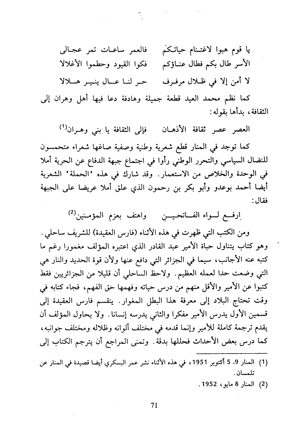 ومن الكتب التي ظهرت في هذه الأثناء (فارس العقيدة) للشريف ساحلي. وهو كتاب يتناول حياة الأمير عبد القادر الذي اعتبره المؤلف مغمورا رغم ما كتبه عنه الأجانب، سيما في الجزائر التي دافع عنها ولأن قوة الحديد والنار هي التي وضعت حدا لعمله العظيم، ولاحظ الساحلي أن قليلا من الجزائريين فقط كتبوا عن الأمير والأقل منهم من درس حياته وفهمها حق الفهم، فجاء كتابه في وقت تحتاج البلاد إلى معرفة هذا البطل المغوار، ينقسم فارس العقيدة إلى قسمين الأول يدرس الأمير مفكرا والثاني يدرسه إنسانا، ولا يحاول المؤلف أن يقدم ترجمة كاملة للأمير وإنما قدمه في مختلف ألوانه وظلاله ومختلف جوانبه، كما درس بعض الأحداث فحللها بدقة، وتمنى المراجع أن يترجم الكتاب إلى