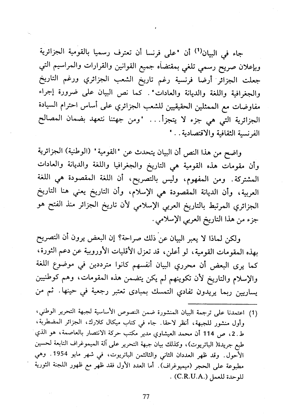 واضح من هذا النص أن البيان يتحدث عن (القومية) (الوطنية) الجزائرية وأن مقومات هذه القومية هي التاريخ والجغرافيا واللغة والديانة والعادات المشتركة، ومن المفهوم، وليس بالتصريح، أن اللغة المقصودة هي اللغة العربية، وأن الديانة المقصودة هي الإسلام، وأن التاريخ يعني هنا التاريخ الجزائري المرتبط بالتاريخ العربي الإسلامي لأن تاريخ الجزائر منذ الفتح هو جزء من هذا التاريخ العربي الإسلامي. ولكن لماذا لا يعبر البيان عن ذلك صراحة؟ إن البعض يرون أن التصريح بهذه المقومات القومية، لو أعلن، قد تعزل الأقليات الأوروبية عن دعم الثورة، كما يرى البعض أن محرري البيان أنفسهم كانوا مترددين في موضوع اللغة والإسلام والتاريخ لأن تكوينهم لم يكن يتضمن هذه المقومات، وهم كوطنيين يساريين ربما يريدون تفادي التمسك بمبادى تعتبر رجعية في حينها، ثم من