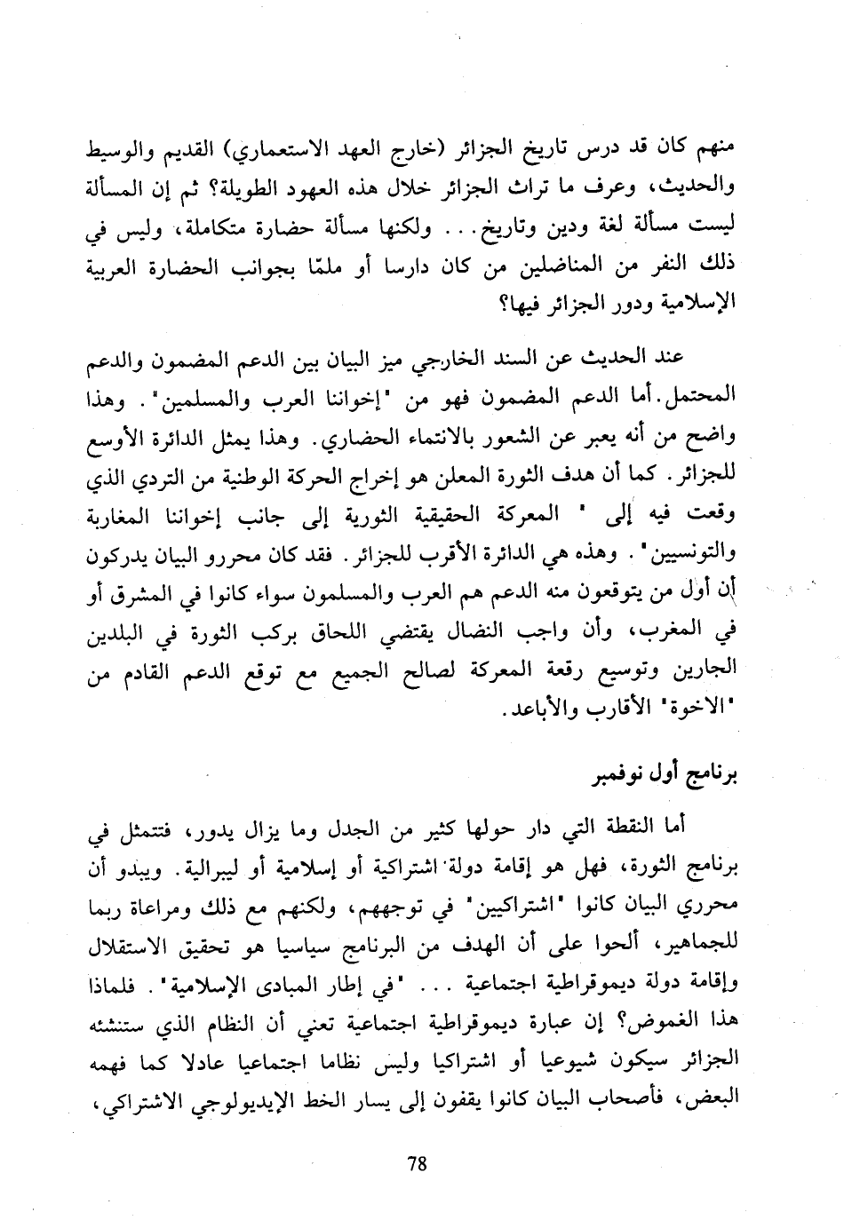 أما النقطة التي دار حولها كثير من الجدل وما يزال يدور، فتتمثل في برنامج الثورة، فهل هو إقامة دولة اشتراكية أو إسلامية أو ليبرالية، ويبدو أن محرري البيان كانوا (اشتراكيين) في توجههم، ولكنهم مع ذلك ومراعاة ربما للجماهير، ألحوا على أن الهدف من البرنامج سياسيا هو تحقيق الاستقلال وإقامة دولة ديموراطية اجتماعية ... (في إطار المبادى الإسلامية)، فلماذا هذا الغموض؟ إن عبارة ديموراطية اجتماعية تعني أن النظام الذي مستنشئه الجزائر سيكون شيوعيا أو اشتراكيا وليس نظاما اجتماعيا عادلا كما فهمه البعض، فأصحاب البيان كانوا يقفون إلى يسار الخط الايديولوجي الاشتراكي.